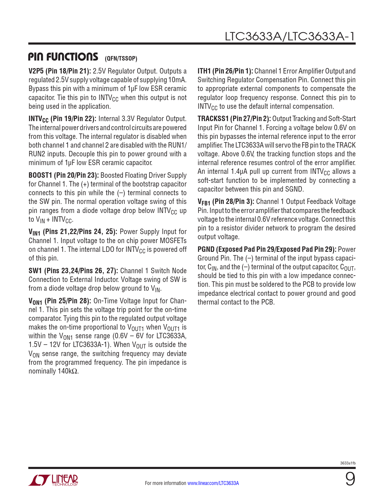 LTC3633A/LTC3633A-1 PIN FUNCTIONS (QFN/TSSOP)V2P5 (Pin 18/Pin 21): 2.5V Regulator Output. Outputs a ITH1 (Pin 26/Pin 1): Channel 1 Error Amplifier Output and regulated 2.5V supply voltage capable of supplying 10mA. Switching Regulator Compensation Pin. Connect this pin Bypass this pin with a minimum of 1µF low ESR ceramic to appropriate external components to compensate the capacitor. Tie this pin to INTVCC when this output is not regulator loop frequency response. Connect this pin to being used in the application. INTVCC to use the default internal compensation. INTVCC (Pin 19/Pin 22): Internal 3.3V Regulator Output. TRACKSS1 (Pin 27/Pin 2): Output Tracking and Soft-Start The internal power drivers and control circuits are powered Input Pin for Channel 1. Forcing a voltage below 0.6V on from this voltage. The internal regulator is disabled when this pin bypasses the internal reference input to the error both channel 1 and channel 2 are disabled with the RUN1/ amplifier. The LTC3633A will servo the FB pin to the TRACK RUN2 inputs. Decouple this pin to power ground with a voltage. Above 0.6V, the tracking function stops and the minimum of 1µF low ESR ceramic capacitor. internal reference resumes control of the error amplifier. BOOST1 (Pin 20/Pin 23): Boosted Floating Driver Supply An internal 1.4µA pull up current from INTVCC allows a for Channel 1. The (+) terminal of the bootstrap capacitor soft-start function to be implemented by connecting a connects to this pin while the (–) terminal connects to capacitor between this pin and SGND. the SW pin. The normal operation voltage swing of this VFB1 (Pin 28/Pin 3): Channel 1 Output Feedback Voltage pin ranges from a diode voltage drop below INTVCC up Pin. Input to the error amplifier that compares the feedback to VIN + INTVCC. voltage to the internal 0.6V reference voltage. Connect this V pin to a resistor divider network to program the desired IN1 (Pins 21,22/Pins 24, 25): Power Supply Input for Channel 1. Input voltage to the on chip power MOSFETs output voltage. on channel 1. The internal LDO for INTVCC is powered off PGND (Exposed Pad Pin 29/Exposed Pad Pin 29): Power of this pin. Ground Pin. The (–) terminal of the input bypass capaci- SW1 (Pins 23,24/Pins 26, 27): Channel 1 Switch Node tor, CIN, and the (–) terminal of the output capacitor, COUT, Connection to External Inductor. Voltage swing of SW is should be tied to this pin with a low impedance connec- from a diode voltage drop below ground to V tion. This pin must be soldered to the PCB to provide low IN. impedance electrical contact to power ground and good VON1 (Pin 25/Pin 28): On-Time Voltage Input for Chan- thermal contact to the PCB. nel 1. This pin sets the voltage trip point for the on-time comparator. Tying this pin to the regulated output voltage makes the on-time proportional to VOUT1 when VOUT1 is within the VON1 sense range (0.6V – 6V for LTC3633A, 1.5V – 12V for LTC3633A-1). When VOUT is outside the VON sense range, the switching frequency may deviate from the programmed frequency. The pin impedance is nominally 140kΩ. 3633a1fb For more information www.linear.com/LTC3633A 9 Document Outline Description Typical Application Absolute Maximum Ratings Pin Configuration Electrical Characteristics Typical Performance Characteristics Pin Functions Operation Applications Information Package Description Typical Application Related Parts