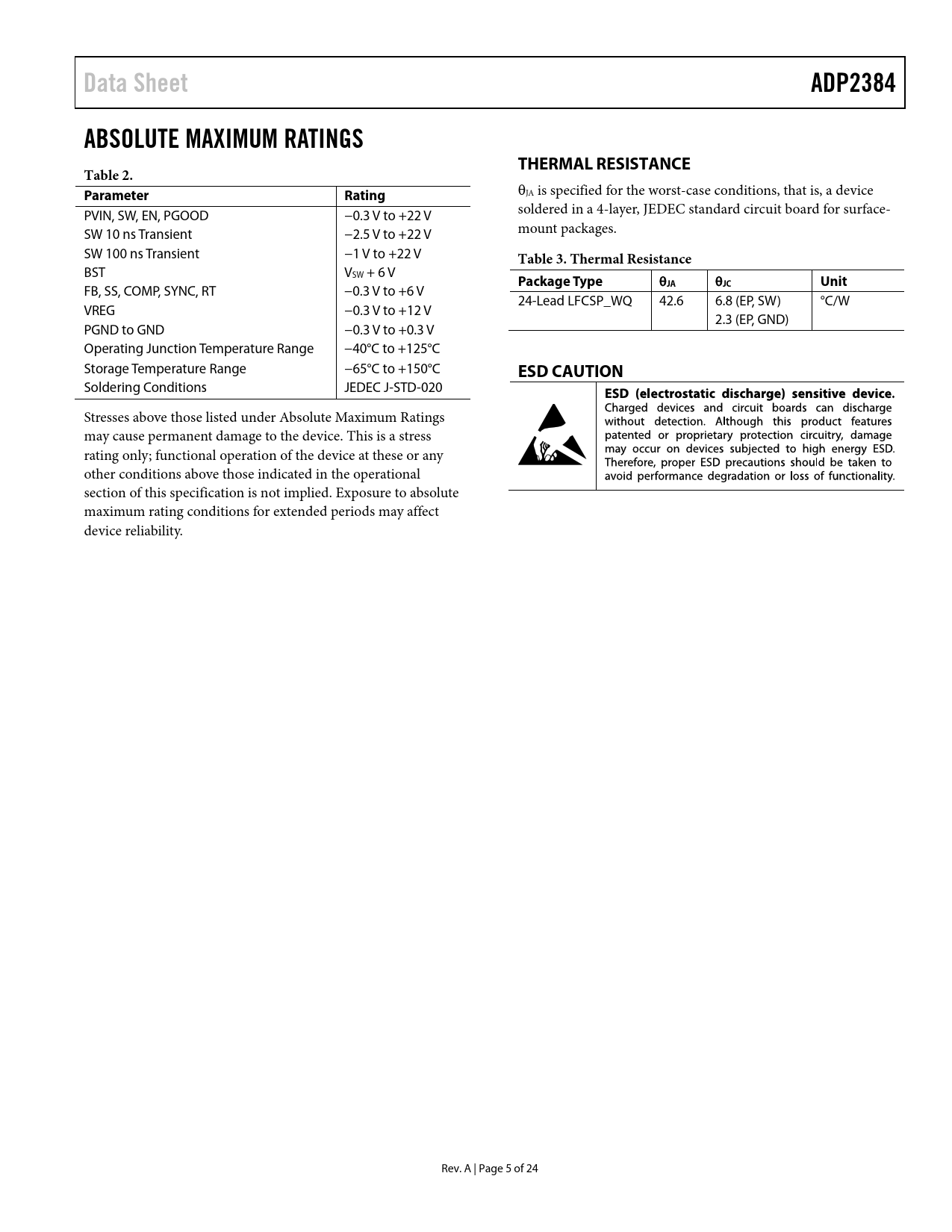 Pages / Page24 / 5 — Data Sheet. ADP2384. ABSOLUTE MAXIMUM RATINGS. THERMAL RESISTANCE. Table …