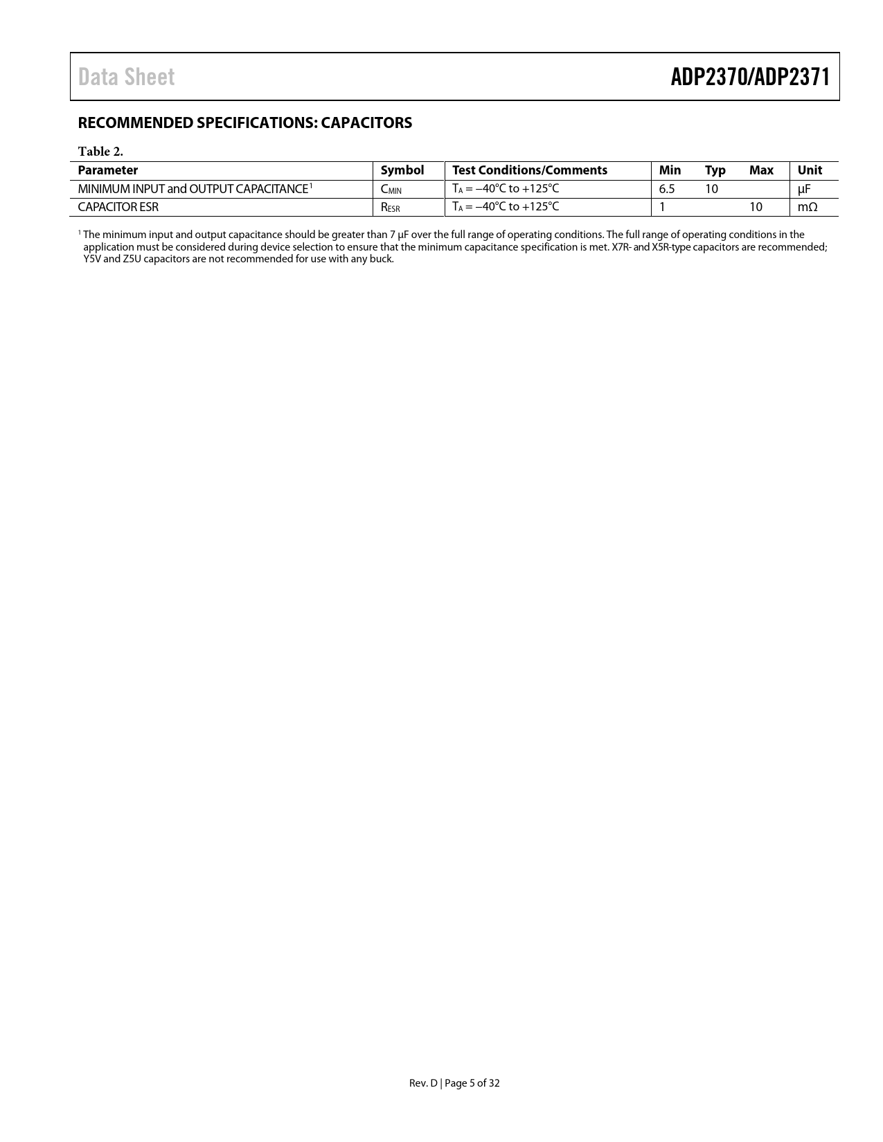 link to page 5 Data SheetADP2370/ADP2371RECOMMENDED SPECIFICATIONS: CAPACITORSTable 2. ParameterSymbolTest Conditions/CommentsMinTypMaxUnit MINIMUM INPUT and OUTPUT CAPACITANCE1 CMIN TA = −40°C to +125°C 6.5 10 µF CAPACITOR ESR RESR TA = −40°C to +125°C 1 10 mΩ 1 The minimum input and output capacitance should be greater than 7 μF over the full range of operating conditions. The full range of operating conditions in the application must be considered during device selection to ensure that the minimum capacitance specification is met. X7R- and X5R-type capacitors are recommended; Y5V and Z5U capacitors are not recommended for use with any buck. Rev. D | Page 5 of 32 Document Outline Features Applications Typical Application Circuit General Description Table of Contents Revision History Specifications Recommended Specifications: Capacitors Absolute Maximum Ratings Thermal Data Thermal Resistance ESD Caution Pin Configuration and Function Descriptions Typical Performance Characteristics Buck Output Theory of Operation PWM Operation PSM Operation Features Descriptions Precision Enable Forced PWM or PWM/PSM Selection Quick Output Discharge (QOD) Function Short-Circuit Protection Undervoltage Lockout Thermal Protection Soft Start Current Limit 100% Duty Cycle Synchronizing Power Good Applications Information ADIsimPower Design Tool External Component Selection Selecting the Inductor Output Capacitor Input Capacitor Adjustable Output Voltage Programming Efficiency Power Switch Conduction Losses Inductor Losses Switching Losses Transition Losses Recommended Buck External Components Capacitor Selection Output Capacitor Input Bypass Capacitor Input and Output Capacitor Properties Thermal Considerations PCB Layout Considerations Packaging and Ordering Information Outline Dimensions Ordering Guide