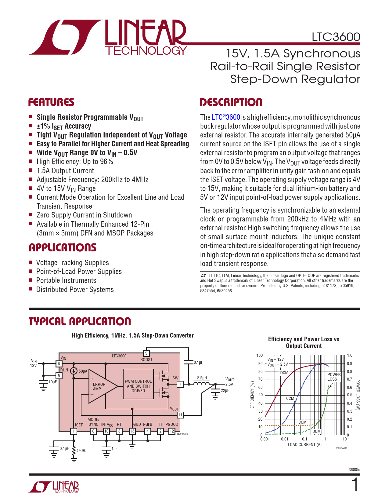 LTC3600 15V, 1.5A Synchronous Rail-to-Rail Single Resistor Step-Down Regulator FeaTuresDescripTion n Single Resistor Programmable VOUT The LTC®3600 is a high efficiency, monolithic synchronous n ±1% ISET Accuracy buck regulator whose output is programmed with just one n Tight VOUT Regulation Independent of VOUT Voltage external resistor. The accurate internally generated 50µA n Easy to Parallel for Higher Current and Heat Spreading current source on the ISET pin allows the use of a single n Wide VOUT Range 0V to VIN – 0.5V external resistor to program an output voltage that ranges n High Efficiency: Up to 96% from 0V to 0.5V below VIN. The VOUT voltage feeds directly n 1.5A Output Current back to the error amplifier in unity gain fashion and equals n Adjustable Frequency: 200kHz to 4MHz the ISET voltage. The operating supply voltage range is 4V n 4V to 15V VIN Range to 15V, making it suitable for dual lithium-ion battery and n Current Mode Operation for Excellent Line and Load 5V or 12V input point-of-load power supply applications. Transient Response The operating frequency is synchronizable to an external n Zero Supply Current in Shutdown clock or programmable from 200kHz to 4MHz with an n Available in Thermally Enhanced 12-Pin external resistor. High switching frequency allows the use (3mm × 3mm) DFN and MSOP Packages of small surface mount inductors. The unique constant on-time architecture is ideal for operating at high frequency applicaTions in high step-down ratio applications that also demand fast n Voltage Tracking Supplies load transient response. n Point-of-Load Power Supplies L, LT, LTC, LTM, Linear Technology, the Linear logo and OPTI-LOOP are registered trademarks n Portable Instruments and Hot Swap is a trademark of Linear Technology Corporation. All other trademarks are the property of their respective owners. Protected by U.S. Patents, including 5481178, 5705919, n Distributed Power Systems 5847554, 6580258. Typical applicaTionHigh Efficiency, 1MHz, 1.5A Step-Down ConverterEfficiency and Power Loss vsOutput Current 9 LTC3600 100 1.0 VIN BOOST V V IN = 12V IN 0.1µF 8 90 V 12V OUT = 2.5V 0.9 RUN 50µA 80 DCM 0.8 POWER 5 + SW 2.2µH V POWER LOSS (W) OUT 70 LOSS 0.7 10µF PWM CONTROL ERROR 7 2.5V AND SWITCH 60 0.6 AMP DRIVER 22µF – 50 0.5 CCM 40 0.4 V EFFICIENCY (%) OUT 30 0.3 11 MODE/ 20 0.2 CCM ISET SYNC INTVCC RT GND PGFB ITH PGOOD 10 0.1 1 6 10 3 13 4 2 12 DCM 3600 TA01a 0 0 0.001 0.01 0.1 1 10 LOAD CURRENT (A) 3600 TA01b 0.1µF 1µF 49.9k 3600fd 1 Document Outline Features Applications Typical Application Description Absolute Maximum Ratings Pin Configuration Order Information Electrical Characteristics Typical Performance Characteristics Pin Functions Functional Diagram Operation Applications Information Typical Applications Package Description Revision History Typical Application Related Parts