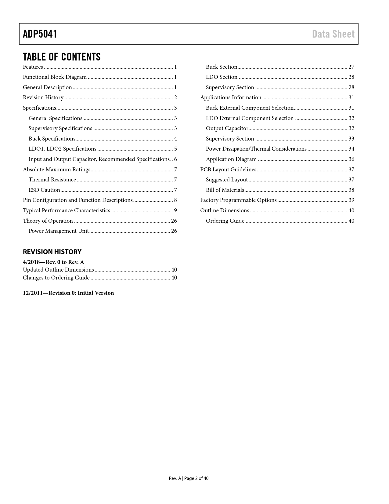 Pages / Page40 / 2 — ADP5041. Data Sheet. TABLE OF CONTENTS. REVISION HISTORY. 4/2018—Rev. 0 …
