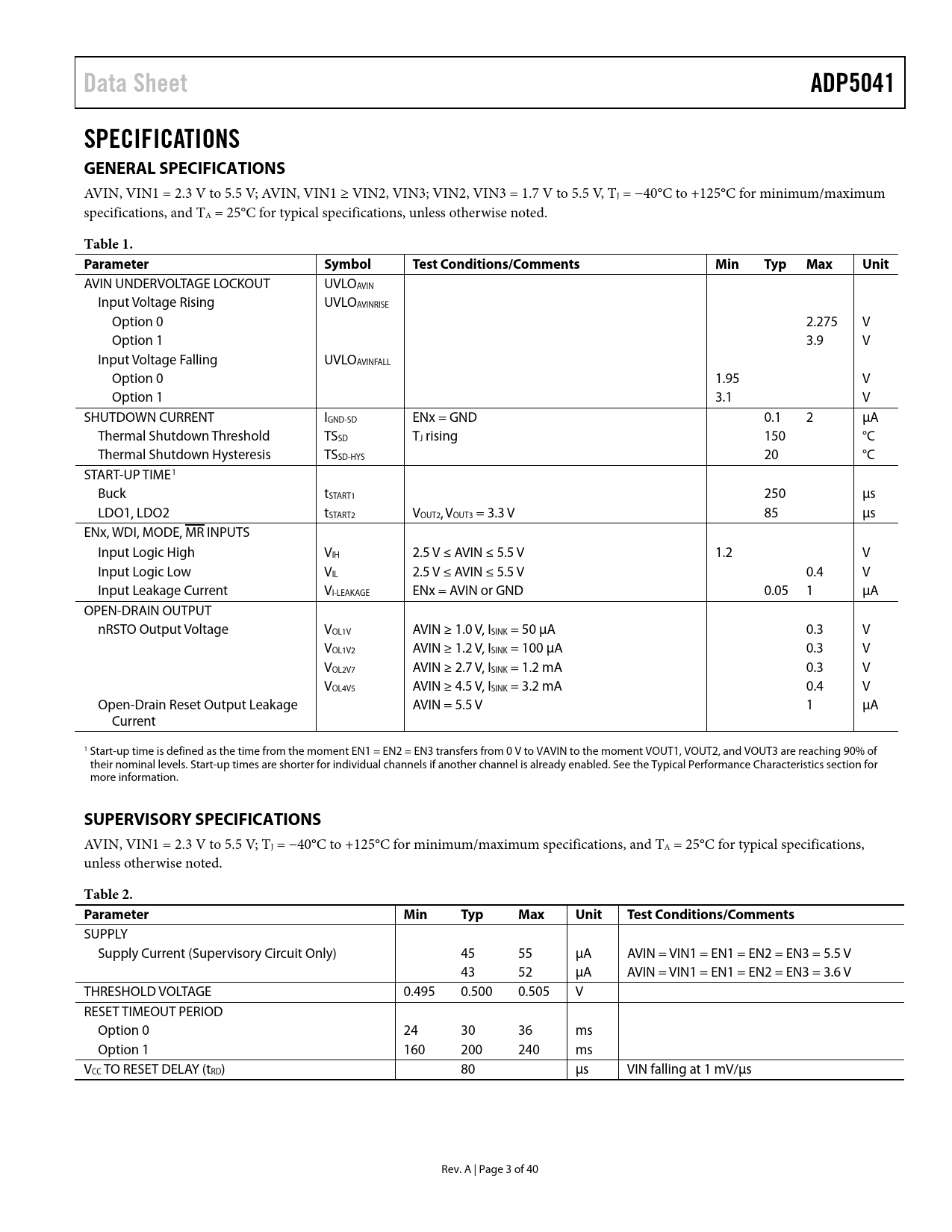 link to page 9 Data SheetADP5041SPECIFICATIONS GENERAL SPECIFICATIONS AVIN, VIN1 = 2.3 V to 5.5 V; AVIN, VIN1 ≥ VIN2, VIN3; VIN2, VIN3 = 1.7 V to 5.5 V, TJ = −40°C to +125°C for minimum/maximum specifications, and TA = 25°C for typical specifications, unless otherwise noted. Table 1. ParameterSymbolTest Conditions/CommentsMinTypMaxUnit AVIN UNDERVOLTAGE LOCKOUT UVLOAVIN Input Voltage Rising UVLOAVINRISE Option 0 2.275 V Option 1 3.9 V Input Voltage Falling UVLOAVINFALL Option 0 1.95 V Option 1 3.1 V SHUTDOWN CURRENT IGND-SD ENx = GND 0.1 2 µA Thermal Shutdown Threshold TSSD TJ rising 150 °C Thermal Shutdown Hysteresis TSSD-HYS 20 °C START-UP TIME1 Buck tSTART1 250 µs LDO1, LDO2 tSTART2 VOUT2, VOUT3 = 3.3 V 85 µs ENx, WDI, MODE, MR INPUTS Input Logic High VIH 2.5 V ≤ AVIN ≤ 5.5 V 1.2 V Input Logic Low VIL 2.5 V ≤ AVIN ≤ 5.5 V 0.4 V Input Leakage Current VI-LEAKAGE ENx = AVIN or GND 0.05 1 µA OPEN-DRAIN OUTPUT nRSTO Output Voltage VOL1V AVIN ≥ 1.0 V, ISINK = 50 µA 0.3 V VOL1V2 AVIN ≥ 1.2 V, ISINK = 100 µA 0.3 V VOL2V7 AVIN ≥ 2.7 V, ISINK = 1.2 mA 0.3 V VOL4V5 AVIN ≥ 4.5 V, ISINK = 3.2 mA 0.4 V Open-Drain Reset Output Leakage AVIN = 5.5 V 1 µA Current 1 Start-up time is defined as the time from the moment EN1 = EN2 = EN3 transfers from 0 V to VAVIN to the moment VOUT1, VOUT2, and VOUT3 are reaching 90% of their nominal levels. Start-up times are shorter for individual channels if another channel is already enabled. See the Typical Performance Characteristics section for more information. SUPERVISORY SPECIFICATIONS AVIN, VIN1 = 2.3 V to 5.5 V; TJ = −40°C to +125°C for minimum/maximum specifications, and TA = 25°C for typical specifications, unless otherwise noted. Table 2. ParameterMinTypMaxUnitTest Conditions/Comments SUPPLY Supply Current (Supervisory Circuit Only) 45 55 µA AVIN = VIN1 = EN1 = EN2 = EN3 = 5.5 V 43 52 µA AVIN = VIN1 = EN1 = EN2 = EN3 = 3.6 V THRESHOLD VOLTAGE 0.495 0.500 0.505 V RESET TIMEOUT PERIOD Option 0 24 30 36 ms Option 1 160 200 240 ms VCC TO RESET DELAY (tRD) 80 µs VIN falling at 1 mV/µs Rev. A | Page 3 of 40 Document Outline FEATURES FUNCTIONAL BLOCK DIAGRAM GENERAL DESCRIPTION TABLE OF CONTENTS REVISION HISTORY SPECIFICATIONS GENERAL SPECIFICATIONS SUPERVISORY SPECIFICATIONS BUCK SPECIFICATIONS LDO1, LDO2 SPECIFICATIONS INPUT AND OUTPUT CAPACITOR, RECOMMENDED SPECIFICATIONS ABSOLUTE MAXIMUM RATINGS THERMAL RESISTANCE ESD CAUTION PIN CONFIGURATION AND FUNCTION DESCRIPTIONS TYPICAL PERFORMANCE CHARACTERISTICS THEORY OF OPERATION POWER MANAGEMENT UNIT Thermal Protection Undervoltage Lockout Enable/Shutdown Active Pull-Down BUCK SECTION Control Scheme PWM Mode Power Save Mode (PSM) PSM Current Threshold Short-Circuit Protection Soft Start Current Limit 100% Duty Operation LDO SECTION SUPERVISORY SECTION Reset Output Manual Reset Input Watchdog Input APPLICATIONS INFORMATION BUCK EXTERNAL COMPONENT SELECTION Feedback Resistors Inductor Output Capacitor Input Capacitor LDO EXTERNAL COMPONENT SELECTION Feedback Resistors OUTPUT CAPACITOR Input Bypass Capacitor Input and Output Capacitor Properties SUPERVISORY SECTION Threshold Setting Resistors Watchdog Input Current Negative-Going Transients at the Monitored Rail Watchdog Software Considerations POWER DISSIPATION/THERMAL CONSIDERATIONS Buck Regulator Power Dissipation LDO Regulator Power Dissipation Junction Temperature APPLICATION DIAGRAM PCB LAYOUT GUIDELINES SUGGESTED LAYOUT BILL OF MATERIALS FACTORY PROGRAMMABLE OPTIONS OUTLINE DIMENSIONS ORDERING GUIDE