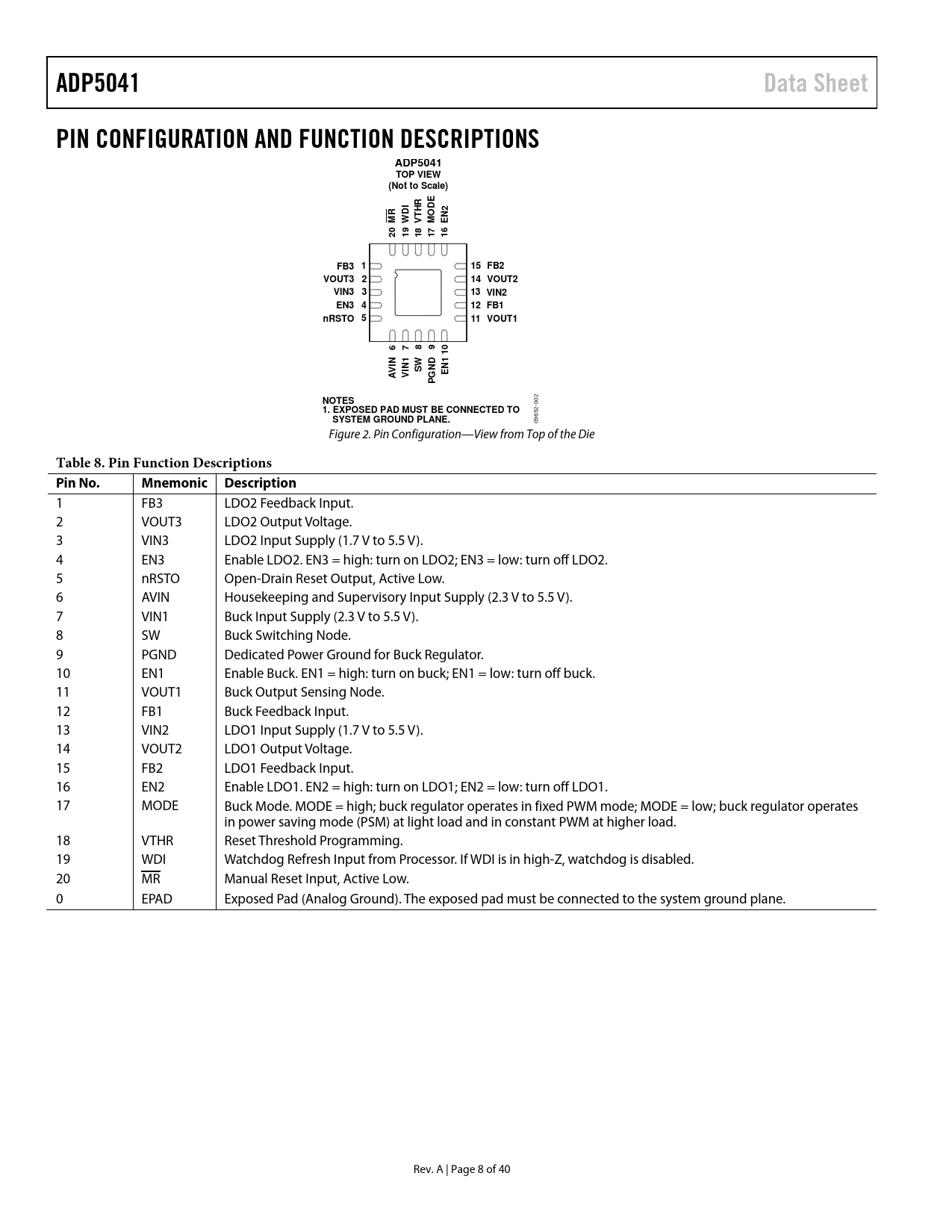 | Pages / Page | 40 / 8 — ADP5041. Data Sheet. PIN CONFIGURATION AND FUNCTION DESCRIPTIONS. TOP … |