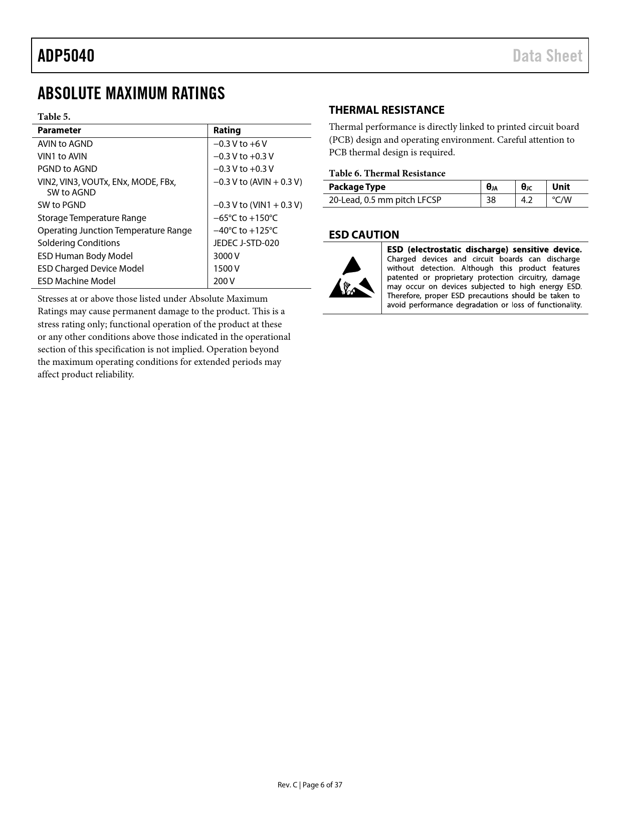 Pages / Page37 / 6 — ADP5040. Data Sheet. ABSOLUTE MAXIMUM RATINGS. THERMAL RESISTANCE. Table …