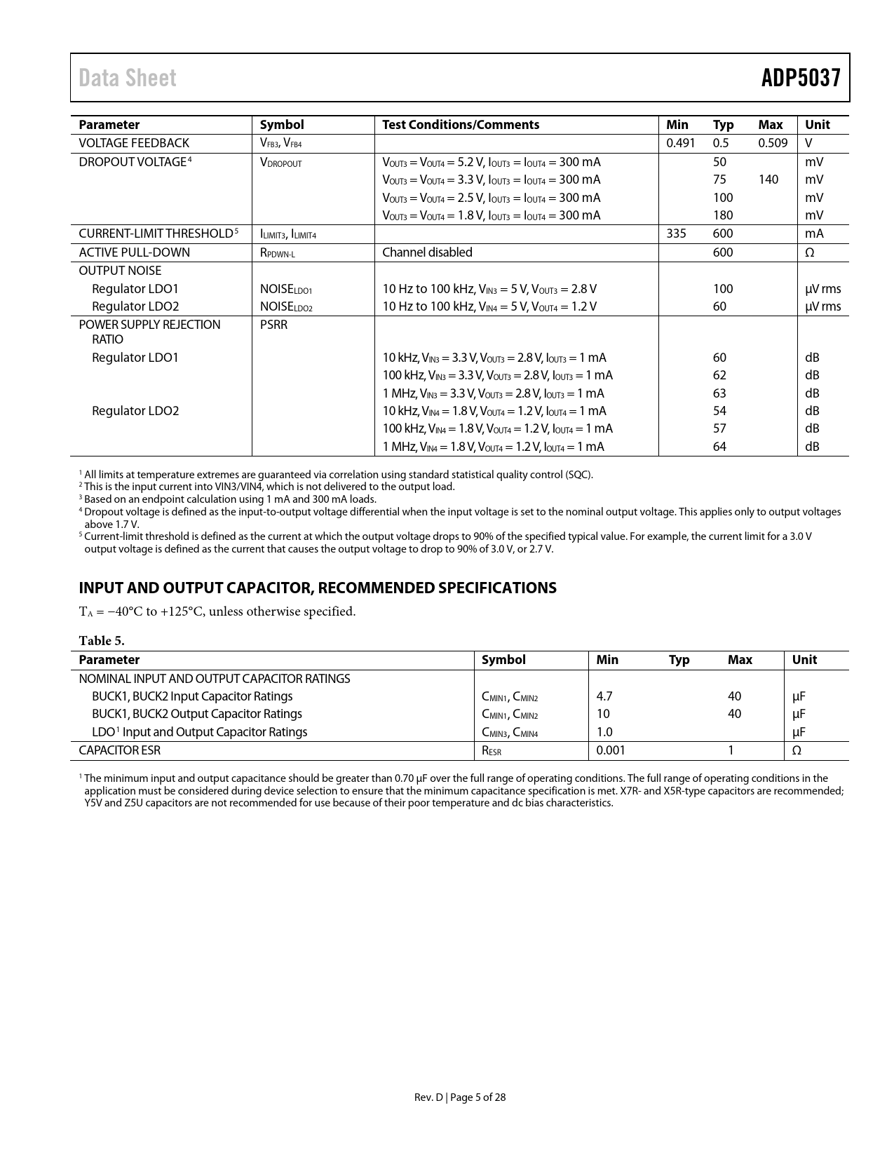 Pages / Page28 / 5 — Data Sheet. ADP5037. Parameter. Symbol. Test Conditions/Comments. Min. …