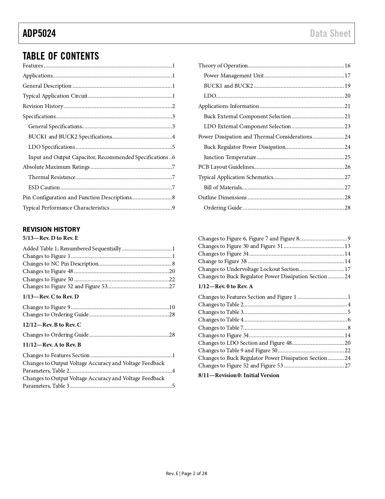 link to page 1 link to page 1 link to page 1 link to page 1 link to page 2 link to page 3 link to page 3 link to page 4 link to page 5 link to page 6 link to page 7 link to page 7 link to page 7 link to page 8 link to page 9 link to page 16 link to page 17 link to page 19 link to page 20 link to page 21 link to page 21 link to page 23 link to page 24 link to page 24 link to page 25 link to page 26 link to page 27 link to page 27 link to page 28 link to page 28 ADP5024Data SheetTABLE OF CONTENTS Features ...1 Theory of Operation.. 16 Applications...1 Power Management Unit ... 17 General Description ..1 BUCK1 and BUCK2 .. 19 Typical Application Circuit..1 LDO... 20 Revision History ..2 Applications Information .. 21 Specifications ...3 Buck External Component Selection ... 21 General Specifications..3 LDO External Component Selection ... 23 BUCK1 and BUCK2 Specifications..4 Power Dissipation and Thermal Considerations ... 24 LDO Specifications ..5 Buck Regulator Power Dissipation... 24 Input and Output Capacitor, Recommended Specifications ..6 Junction Temperature .. 25 Absolute Maximum Ratings ..7 PCB Layout Guidelines.. 26 Thermal Resistance ..7 Typical Application Schematics ... 27 ESD Caution ..7 Bill of Materials.. 27 Pin Configuration and Function Descriptions...8 Outline Dimensions .. 28 Typical Performance Characteristics ...9 Ordering Guide ... 28 REVISION HISTORY 5/13—Rev. D to Rev. E Changes to Figure 6, Figure 7 and Figure 8.. 9 Added Table 1; Renumbered Sequential y ...1 Changes to Figure 30 and Figure 31 .. 13 Changes to Figure 1 ...1 Changes to Figure 34 ... 14 Changes to NC Pin Description...8 Change to Figure 38 .. 14 Changes to Figure 48 ...20 Changes to Undervoltage Lockout Section .. 17 Changes to Figure 50 ...22 Changes to Buck Regulator Power Dissipation Section ... 24 Changes to Figure 52 and Figure 53...27 1/12—Rev. 0 to Rev. A1/13—Rev. C to Rev. D Changes to Features Section and Figure 1 ... 1 Changes to Figure 9 ...10 Changes to Table 2... 4 Changes to Ordering Guide ...28 Changes to Table 3... 5 Changes to Table 4... 6 12/12—Rev. B to Rev. C Changes to Table 7... 8 Changes to Ordering Guide ...28 Changes to Figure 34 ... 14 11/12—Rev. A to Rev. B Changes to LDO Section and Figure 48... 20 Changes to Table 9 and Figure 50 .. 22 Changes to Features Section ..1 Changes to Buck Regulator Power Dissipation Section ... 24 Changes to Output Voltage Accuracy and Voltage Feedback Changes to Figure 52 and Figure 53 .. 27 Parameters, Table 2 ..4 Changes to Output Voltage Accuracy and Voltage Feedback 8/11—Revision 0: Initial Version Parameters, Table 3 ..5 Rev. E | Page 2 of 28 Document Outline Features Applications General Description Typical Application Circuit Revision History Specifications General Specifications BUCK1 and BUCK2 Specifications LDO Specifications Input and Output Capacitor, Recommended Specifications Absolute Maximum Ratings Thermal Resistance ESD Caution Pin Configuration and Function Descriptions Typical Performance Characteristics Theory of Operation Power Management Unit Thermal Protection Undervoltage Lockout Enable/Shutdown BUCK1 and BUCK2 Control Scheme PWM Mode Power Save Mode (PSM) PSM Current Threshold Oscillator/Phasing of Inductor Switching Short-Circuit Protection Soft Start Current Limit 100% Duty Operation Active Pull-Down Resistors LDO Applications Information Buck External Component Selection Feedback Resistors Inductor Output Capacitor Input Capacitor LDO External Component Selection Feedback Resistors Output Capacitor Input Bypass Capacitor Input and Output Capacitor Properties Power Dissipation and Thermal Considerations Buck Regulator Power Dissipation LDO Regulator Power Dissipation Junction Temperature PCB Layout Guidelines Typical Application Schematics Bill of Materials Outline Dimensions Ordering Guide