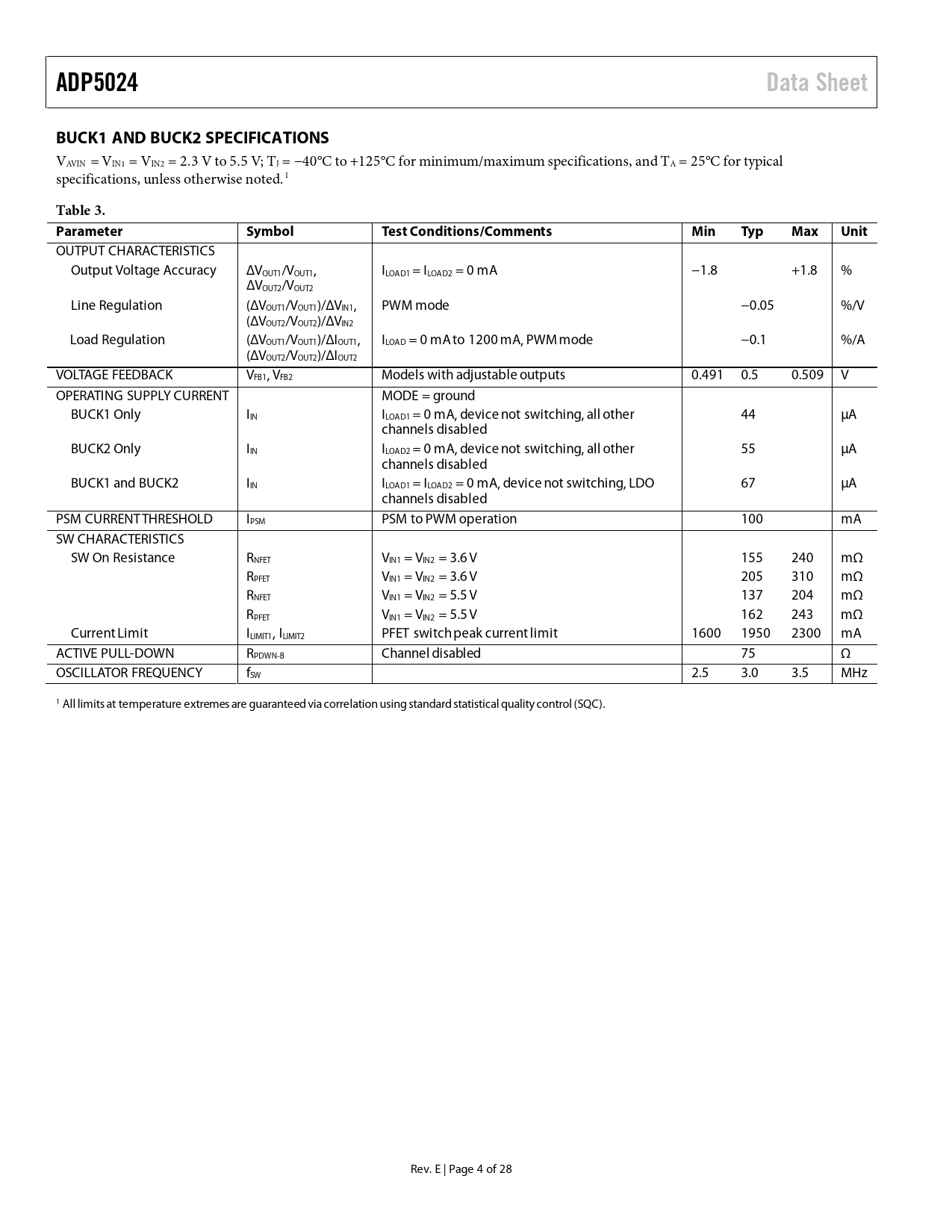 Pages / Page28 / 4 — ADP5024. Data Sheet. BUCK1 AND BUCK2 SPECIFICATIONS. Table 3. Parameter. …