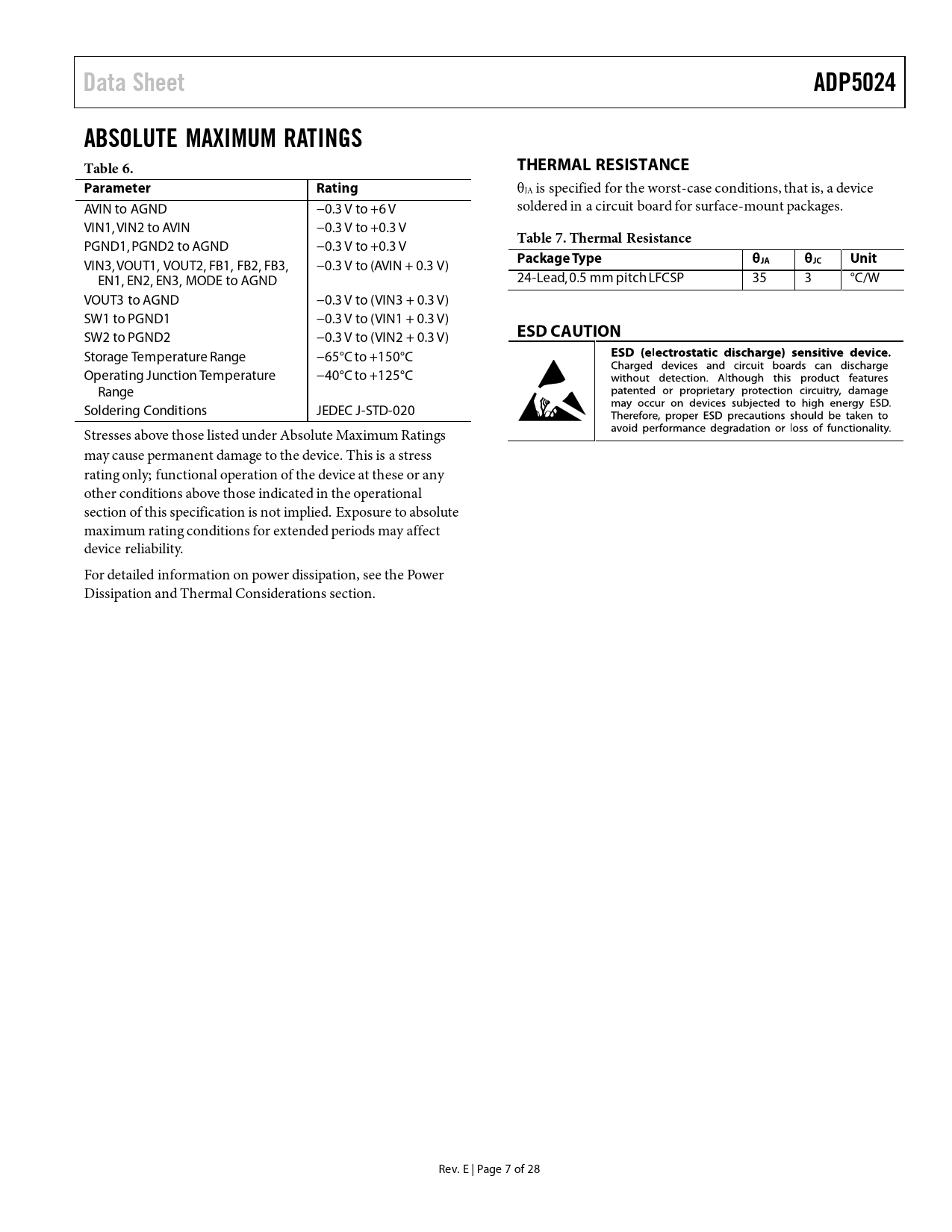 link to page 24 link to page 24 Data SheetADP5024ABSOLUTE MAXIMUM RATINGS Table 6.THERMAL RESISTANCEParameterRating θJA is specified for the worst-case conditions, that is, a device AVIN to AGND −0.3 V to +6 V soldered in a circuit board for surface-mount packages. VIN1, VIN2 to AVIN −0.3 V to +0.3 V Table 7. Thermal Resistance PGND1, PGND2 to AGND −0.3 V to +0.3 V VIN3, VOUT1, VOUT2, FB1, FB2, FB3, −0.3 V to (AVIN + 0.3 V) Package TypeθJAθJCUnit EN1, EN2, EN3, MODE to AGND 24-Lead, 0.5 mm pitch LFCSP 35 3 °C/W VOUT3 to AGND −0.3 V to (VIN3 + 0.3 V) SW1 to PGND1 −0.3 V to (VIN1 + 0.3 V) SW2 to PGND2 −0.3 V to (VIN2 + 0.3 V) ESD CAUTION Storage Temperature Range −65°C to +150°C Operating Junction Temperature −40°C to +125°C Range Soldering Conditions JEDEC J-STD-020 Stresses above those listed under Absolute Maximum Ratings may cause permanent damage to the device. This is a stress rating only; functional operation of the device at these or any other conditions above those indicated in the operational section of this specification is not implied. Exposure to absolute maximum rating conditions for extended periods may affect device reliability. For detailed information on power dissipation, see the Power Dissipation and Thermal Considerations section. Rev. E | Page 7 of 28 Document Outline Features Applications General Description Typical Application Circuit Revision History Specifications General Specifications BUCK1 and BUCK2 Specifications LDO Specifications Input and Output Capacitor, Recommended Specifications Absolute Maximum Ratings Thermal Resistance ESD Caution Pin Configuration and Function Descriptions Typical Performance Characteristics Theory of Operation Power Management Unit Thermal Protection Undervoltage Lockout Enable/Shutdown BUCK1 and BUCK2 Control Scheme PWM Mode Power Save Mode (PSM) PSM Current Threshold Oscillator/Phasing of Inductor Switching Short-Circuit Protection Soft Start Current Limit 100% Duty Operation Active Pull-Down Resistors LDO Applications Information Buck External Component Selection Feedback Resistors Inductor Output Capacitor Input Capacitor LDO External Component Selection Feedback Resistors Output Capacitor Input Bypass Capacitor Input and Output Capacitor Properties Power Dissipation and Thermal Considerations Buck Regulator Power Dissipation LDO Regulator Power Dissipation Junction Temperature PCB Layout Guidelines Typical Application Schematics Bill of Materials Outline Dimensions Ordering Guide