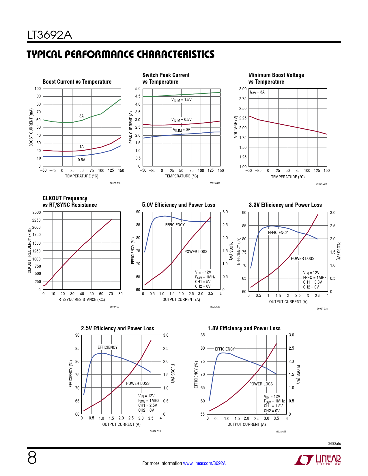2500 90 3.0 90 3.0 2250 85 EFFICIENCY 2.5 2000 85 2.5 1750 EFFICIENCY 80 2.0 PLOSS (W) 80 2.0 PLOSS (W) 1500 1250 75 POWER LOSS 1.5 75 1.5 1000 POWER LOSS EFFICIENCY (%) 70 1.0 EFFICIENCY (%) 750 70 1.0 CLKOUT FREQUENCY (kHz) 500 VIN = 12V VIN = 12V 65 F 0.5 SW = 1MHz 65 FREQ = 1MHz 0.5 250 CH1 = 5V CH1 = 3.3V CH2 = 0V CH2 = 0V 0 60 0 0 10 20 30 40 50 60 70 80 0 0.5 1.0 1.5 2.0 2.5 3.0 3.5 4 60 0 0 0.5 1 1.5 2 2.5 3 3.5 4 RT/SYNC RESISTANCE (kΩ) OUTPUT CURRENT (A) OUTPUT CURRENT (A) 3692A G21 3692A G22 3692A G23