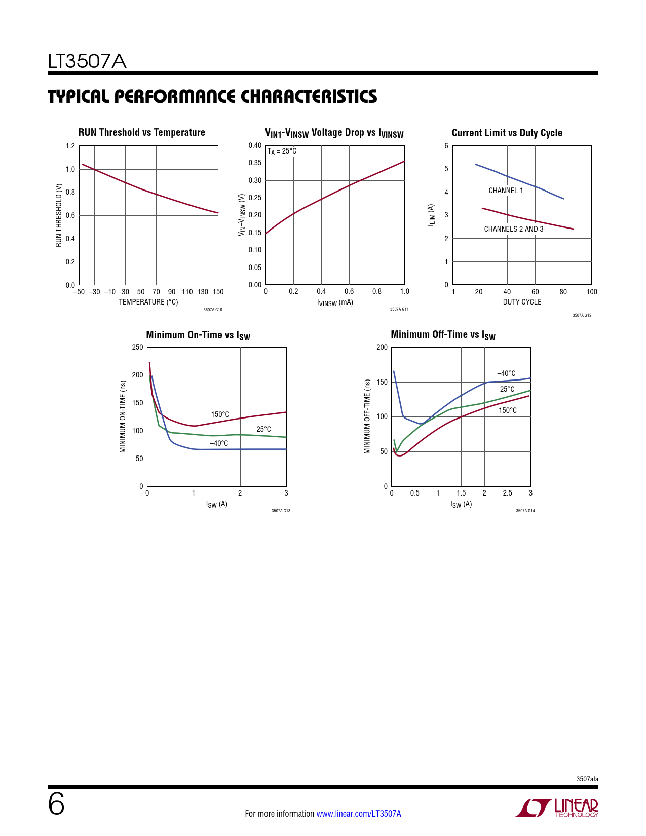 1.2 0.40 6 TA = 25°C 0.35 1.0 5 0.30 0.8 4 CHANNEL 1 (V) 0.25 0.6 (A) INSW 0.20 3 –V I LIM V IN 0.15 CHANNELS 2 AND 3 0.4 2 RUN THRESHOLD (V) 0.10 0.2 1 0.05 0.0 0.00 0 –50 –30 –10 30 50 70 90 110 130 150 0 0.2 0.4 0.6 0.8 1.0 1 20 40 60 80 100 TEMPERATURE (°C) IVINSW (mA) DUTY CYCLE 3507A G10 3507A G11 3507A G12