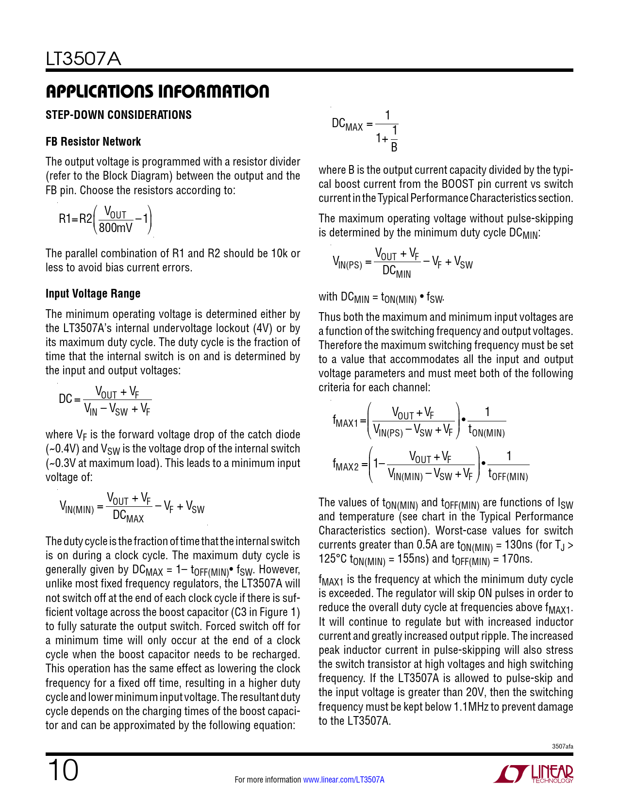 LT3507A applications inForMation STEP-DOWN CONSIDERATIONS 1 DCMAX = 1 FB Resistor Network 1+ B The output voltage is programmed with a resistor divider (refer to the Block Diagram) between the output and the where B is the output current capacity divided by the typi- FB pin. Choose the resistors according to: cal boost current from the BOOST pin current vs switch current in the Typical Performance Characteristics section. ⎛ V R1 ⎞ =R2 OUT ⎜ –1⎟ The maximum operating voltage without pulse-skipping ⎝800mV ⎠ is determined by the minimum duty cycle DCMIN: The parallel combination of R1 and R2 should be 10k or VOUT + VF less to avoid bias current errors. VIN(PS) = – VF + VSW DCMIN Input Voltage Range with DCMIN = tON(MIN) • fSW. The minimum operating voltage is determined either by Thus both the maximum and minimum input voltages are the LT3507A’s internal undervoltage lockout (4V) or by a function of the switching frequency and output voltages. its maximum duty cycle. The duty cycle is the fraction of Therefore the maximum switching frequency must be set time that the internal switch is on and is determined by to a value that accommodates all the input and output the input and output voltages: voltage parameters and must meet both of the following V criteria for each channel: DC = OUT + VF VIN – VSW + VF ⎛ ⎞ f VOUT +VF MAX1 =⎜⎜ ⎟⎟• 1 where V V t F is the forward voltage drop of the catch diode ⎝ IN(PS) – VSW + VF ⎠ ON(MIN) (~0.4V) and VSW is the voltage drop of the internal switch ⎛ ⎞ (~0.3V at maximum load). This leads to a minimum input fMAX2 =⎜1– VOUT +VF ⎟ voltage of: ⎜ V ⎟• 1 t ⎝ IN(MIN) – VSW + VF ⎠ OFF(MIN) V V OUT + VF The values of t IN(MIN) = – VF + VSW ON(MIN) and tOFF(MIN) are functions of ISW DCMAX and temperature (see chart in the Typical Performance Characteristics section). Worst-case values for switch The duty cycle is the fraction of time that the internal switch currents greater than 0.5A are t is on during a clock cycle. The maximum duty cycle is ON(MIN) = 130ns (for TJ > 125°C t generally given by DC ON(MIN) = 155ns) and tOFF(MIN) = 170ns. MAX = 1– tOFF(MIN)• fSW. However, unlike most fixed frequency regulators, the LT3507A will fMAX1 is the frequency at which the minimum duty cycle not switch off at the end of each clock cycle if there is suf- is exceeded. The regulator will skip ON pulses in order to ficient voltage across the boost capacitor (C3 in Figure 1) reduce the overall duty cycle at frequencies above fMAX1. to fully saturate the output switch. Forced switch off for It will continue to regulate but with increased inductor a minimum time will only occur at the end of a clock current and greatly increased output ripple. The increased cycle when the boost capacitor needs to be recharged. peak inductor current in pulse-skipping will also stress This operation has the same effect as lowering the clock the switch transistor at high voltages and high switching frequency for a fixed off time, resulting in a higher duty frequency. If the LT3507A is allowed to pulse-skip and cycle and lower minimum input voltage. The resultant duty the input voltage is greater than 20V, then the switching cycle depends on the charging times of the boost capaci- frequency must be kept below 1.1MHz to prevent damage tor and can be approximated by the following equation: to the LT3507A. 3507afa 10 For more information www.linear.com/LT3507A Document Outline Features Applications Description Typical Application Absolute Maximum Ratings Pin Configuration Order Information Electrical Characteristics Typical Performance Characteristics Pin Functions Block Diagram Operation Applications Information Typical Applications Package Description Package Description Typical Applications Related Parts
