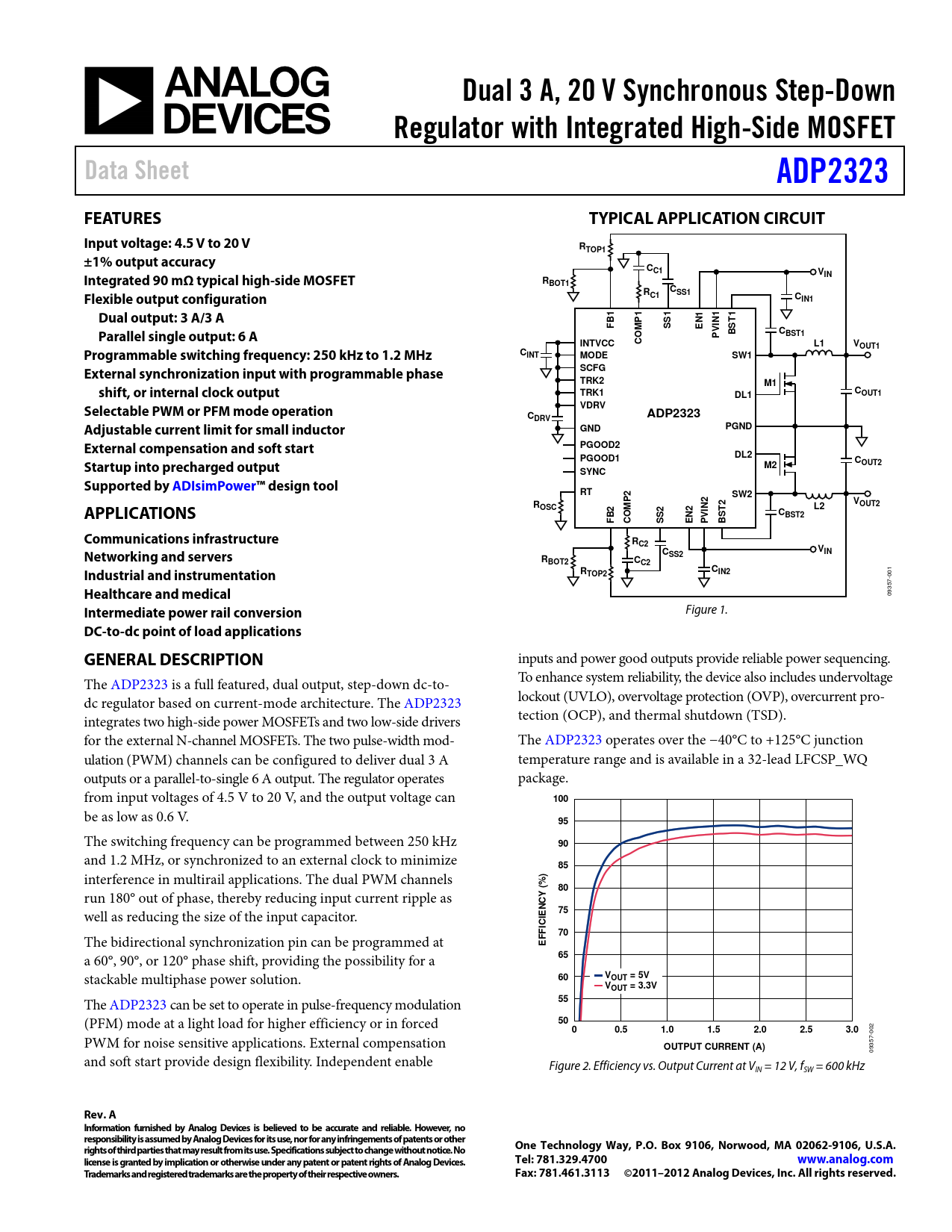 Dual 3 A, 20 V Synchronous Step-Down. Regulator with Integrated High-Side MOSFET. Data Sheet. ADP2323. FEATURES