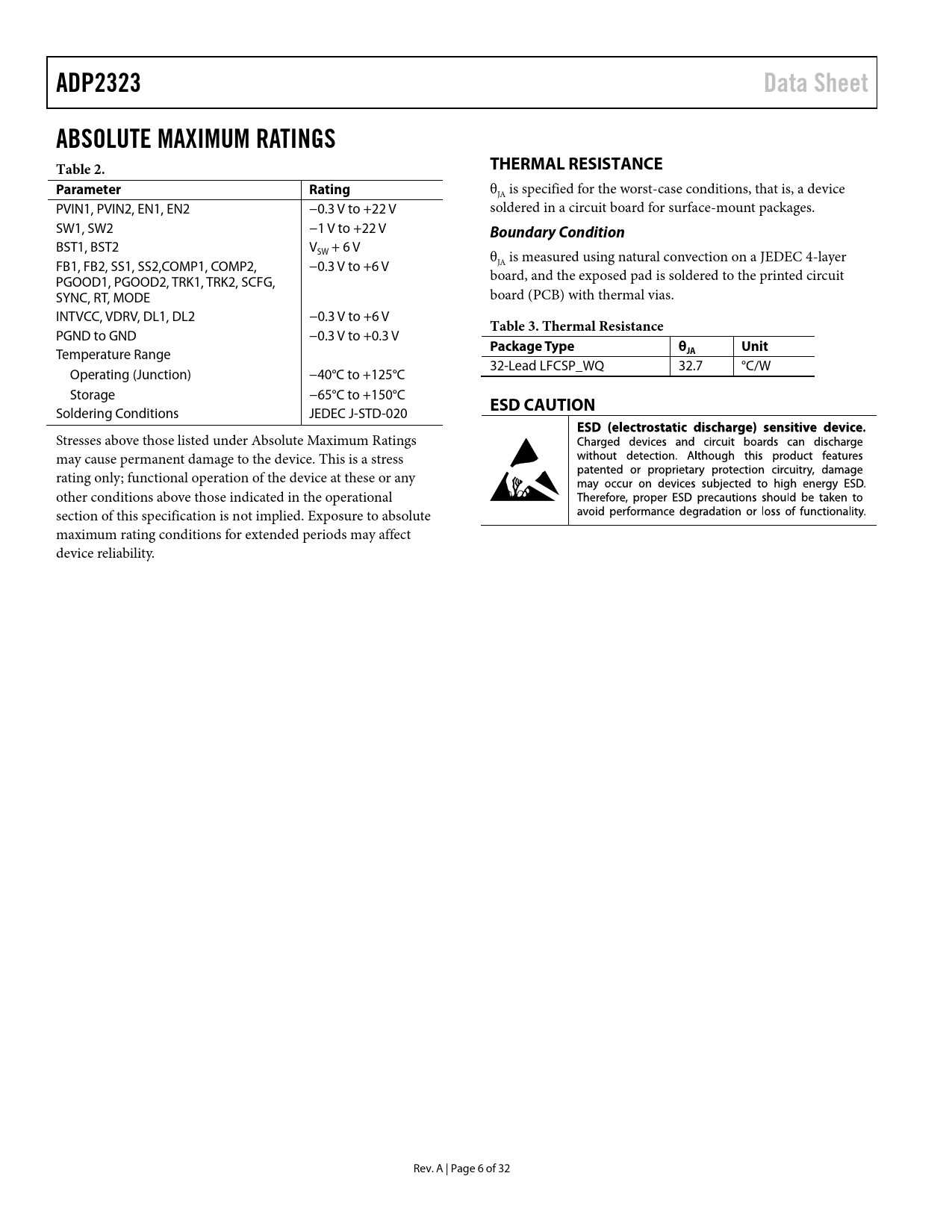 ADP2323Data SheetABSOLUTE MAXIMUM RATINGS Table 2.THERMAL RESISTANCEParameterRating θJA is specified for the worst-case conditions, that is, a device PVIN1, PVIN2, EN1, EN2 −0.3 V to +22 V soldered in a circuit board for surface-mount packages. SW1, SW2 −1 V to +22 V Boundary Condition BST1, BST2 V + 6 V SW θ FB1, FB2, SS1, SS2,COMP1, COMP2, −0.3 V to +6 V JA is measured using natural convection on a JEDEC 4-layer PGOOD1, PGOOD2, TRK1, TRK2, SCFG, board, and the exposed pad is soldered to the printed circuit SYNC, RT, MODE board (PCB) with thermal vias. INTVCC, VDRV, DL1, DL2 −0.3 V to +6 V Table 3. Thermal Resistance PGND to GND −0.3 V to +0.3 V Package TypeθUnit Temperature Range JA 32-Lead LFCSP_WQ 32.7 °C/W Operating (Junction) −40°C to +125°C Storage −65°C to +150°C ESD CAUTION Soldering Conditions JEDEC J-STD-020 Stresses above those listed under Absolute Maximum Ratings may cause permanent damage to the device. This is a stress rating only; functional operation of the device at these or any other conditions above those indicated in the operational section of this specification is not implied. Exposure to absolute maximum rating conditions for extended periods may affect device reliability. Rev. A | Page 6 of 32 Document Outline Features Applications Typical Application Circuit General Description Revision History Functional Block Diagram Specifications Absolute Maximum Ratings Thermal Resistance Boundary Condition ESD Caution Pin Configuration and Function Descriptions Typical Performance Characteristics Theory of Operation Control Scheme PWM Mode PFM Mode Precision Enable/Shutdown Separate Input Voltages Internal Regulator (INTVCC) Bootstrap Circuitry Low-Side Driver Oscillator Synchronization Soft Start Peak Current-Limit and Short-Circuit Protection Voltage Tracking Parallel Operation Power Good Overvoltage Protection Undervoltage Lockout Thermal Shutdown Applications Information ADIsimPower Design Tool Input Capacitor Selection Output Voltage Setting Voltage Conversion Limitations Current-Limit Setting Inductor Selection Output Capacitor Selection Low-Side Power Device Selection Programming UVLO Input Compensation Components Design Design Example Output Voltage Setting Current-Limit Setting Frequency Setting Inductor Selection Output Capacitor Selection Low-Side MOSFET Selection Compensation Components Soft Start Time Programming Input Capacitor Selection External Components Recommendation Typical Application Circuits Outline Dimensions Ordering Guide