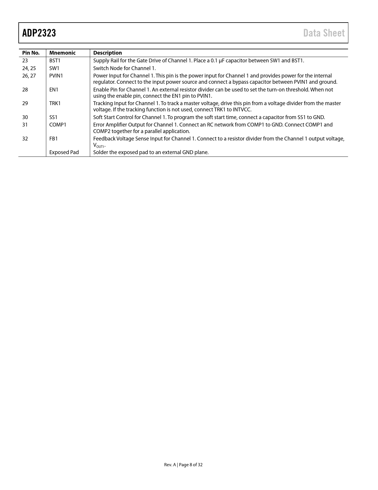 ADP2323Data SheetPin No.MnemonicDescription 23 BST1 Supply Rail for the Gate Drive of Channel 1. Place a 0.1 µF capacitor between SW1 and BST1. 24, 25 SW1 Switch Node for Channel 1. 26, 27 PVIN1 Power Input for Channel 1. This pin is the power input for Channel 1 and provides power for the internal regulator. Connect to the input power source and connect a bypass capacitor between PVIN1 and ground. 28 EN1 Enable Pin for Channel 1. An external resistor divider can be used to set the turn-on threshold. When not using the enable pin, connect the EN1 pin to PVIN1. 29 TRK1 Tracking Input for Channel 1. To track a master voltage, drive this pin from a voltage divider from the master voltage. If the tracking function is not used, connect TRK1 to INTVCC. 30 SS1 Soft Start Control for Channel 1. To program the soft start time, connect a capacitor from SS1 to GND. 31 COMP1 Error Amplifier Output for Channel 1. Connect an RC network from COMP1 to GND. Connect COMP1 and COMP2 together for a parallel application. 32 FB1 Feedback Voltage Sense Input for Channel 1. Connect to a resistor divider from the Channel 1 output voltage, V . OUT1 Exposed Pad Solder the exposed pad to an external GND plane. Rev. A | Page 8 of 32 Document Outline Features Applications Typical Application Circuit General Description Revision History Functional Block Diagram Specifications Absolute Maximum Ratings Thermal Resistance Boundary Condition ESD Caution Pin Configuration and Function Descriptions Typical Performance Characteristics Theory of Operation Control Scheme PWM Mode PFM Mode Precision Enable/Shutdown Separate Input Voltages Internal Regulator (INTVCC) Bootstrap Circuitry Low-Side Driver Oscillator Synchronization Soft Start Peak Current-Limit and Short-Circuit Protection Voltage Tracking Parallel Operation Power Good Overvoltage Protection Undervoltage Lockout Thermal Shutdown Applications Information ADIsimPower Design Tool Input Capacitor Selection Output Voltage Setting Voltage Conversion Limitations Current-Limit Setting Inductor Selection Output Capacitor Selection Low-Side Power Device Selection Programming UVLO Input Compensation Components Design Design Example Output Voltage Setting Current-Limit Setting Frequency Setting Inductor Selection Output Capacitor Selection Low-Side MOSFET Selection Compensation Components Soft Start Time Programming Input Capacitor Selection External Components Recommendation Typical Application Circuits Outline Dimensions Ordering Guide