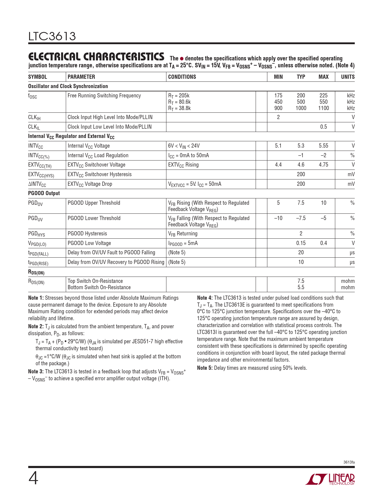 The LTC3613 is tested under pulsed load conditions such that cause permanent damage to the device. Exposure to any Absolute TJ ≈ TA. The LTC3613E is guaranteed to meet specifications from Maximum Rating condition for extended periods may affect device 0°C to 125°C junction temperature. Specifications over the –40°C to reliability and lifetime. 125°C operating junction temperature range are assured by design,