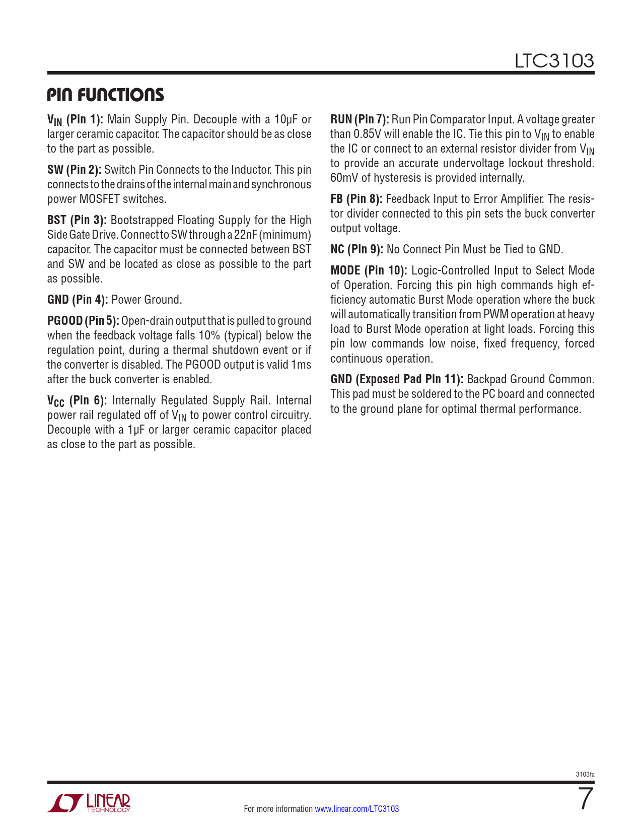 PIN FUNCTIONS. VIN (Pin 1):. RUN (Pin 7):. SW (Pin 2):. FB (Pin 8):. BST (Pin 3):. NC (Pin 9):. MODE (Pin 10):. GND (Pin 4):