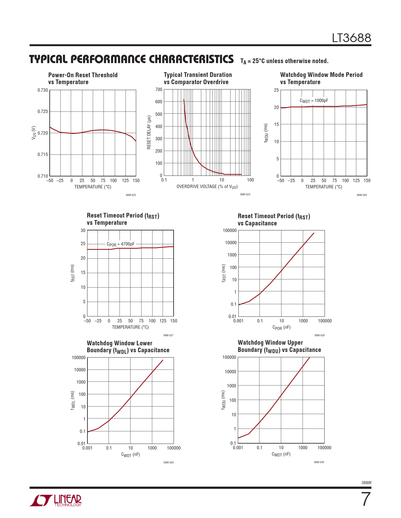 0.730 700 25 600 CWDT = 1000pF 20 0.725 500 Y (μs) 400 15 (V) 0.720 (ms) UV V 300 t WDU 10 RESET DELA 200 0.715 5 100 0.710 0 0 –50 –25 0 25 50 75 100 125 150 0.1 1 10 100 –50 –25 0 25 50 75 100 125 150 TEMPERATURE (°C) OVERDRIVE VOLTAGE (% of VUV) TEMPERATURE (°C) 3688 G23 3688 G24 3688 G26