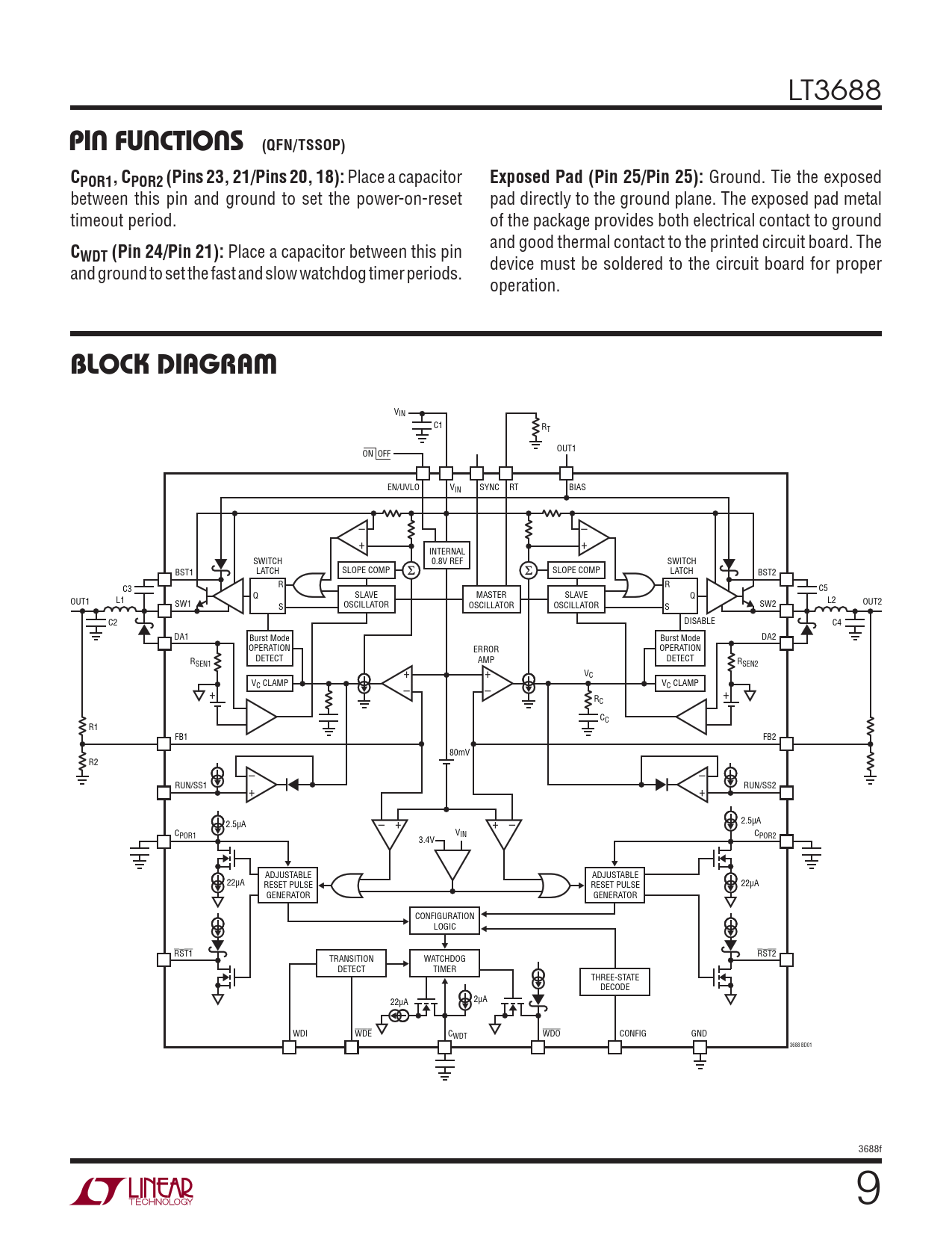 LT3688 PIN FUNCTIONS (QFN/TSSOP)CPOR1, CPOR2 (Pins 23, 21/Pins 20, 18): Place a capacitor Exposed Pad (Pin 25/Pin 25): Ground. Tie the exposed between this pin and ground to set the power-on-reset pad directly to the ground plane. The exposed pad metal timeout period. of the package provides both electrical contact to ground and good thermal contact to the printed circuit board. The CWDT (Pin 24/Pin 21): Place a capacitor between this pin device must be soldered to the circuit board for proper and ground to set the fast and slow watchdog timer periods. operation. BLOCK DIAGRAM VIN C1 RT OUT1 ON OFF EN/UVLO V SYNC RT BIAS IN – – + + INTERNAL SWITCH 0.8V REF SWITCH LATCH SLOPE COMP SLOPE COMP LATCH BST1 BST2 R R C3 C5 Q SLAVE MASTER SLAVE Q OUT1 L1 L2 SW1 OSCILLATOR OSCILLATOR OSCILLATOR SW2 OUT2 S S C2 DISABLE C4 DA1 DA2 Burst Mode Burst Mode OPERATION ERROR OPERATION DETECT AMP DETECT R R SEN1 SEN2 + + VC V V C CLAMP C CLAMP – – + + RC CC R1 FB1 FB2 80mV R2 – – RUN/SS1 + + RUN/SS2 – + + – 2.5μA 2.5μA C V POR1 IN C 3.4V POR2 ADJUSTABLE ADJUSTABLE 22μA RESET PULSE RESET PULSE 22μA GENERATOR GENERATOR CONFIGURATION LOGIC RST1 RST2 TRANSITION WATCHDOG DETECT TIMER THREE-STATE DECODE 2μA 22μA WDI WDE CWDT WDO CONFIG GND 3688 BD01 3688f 9