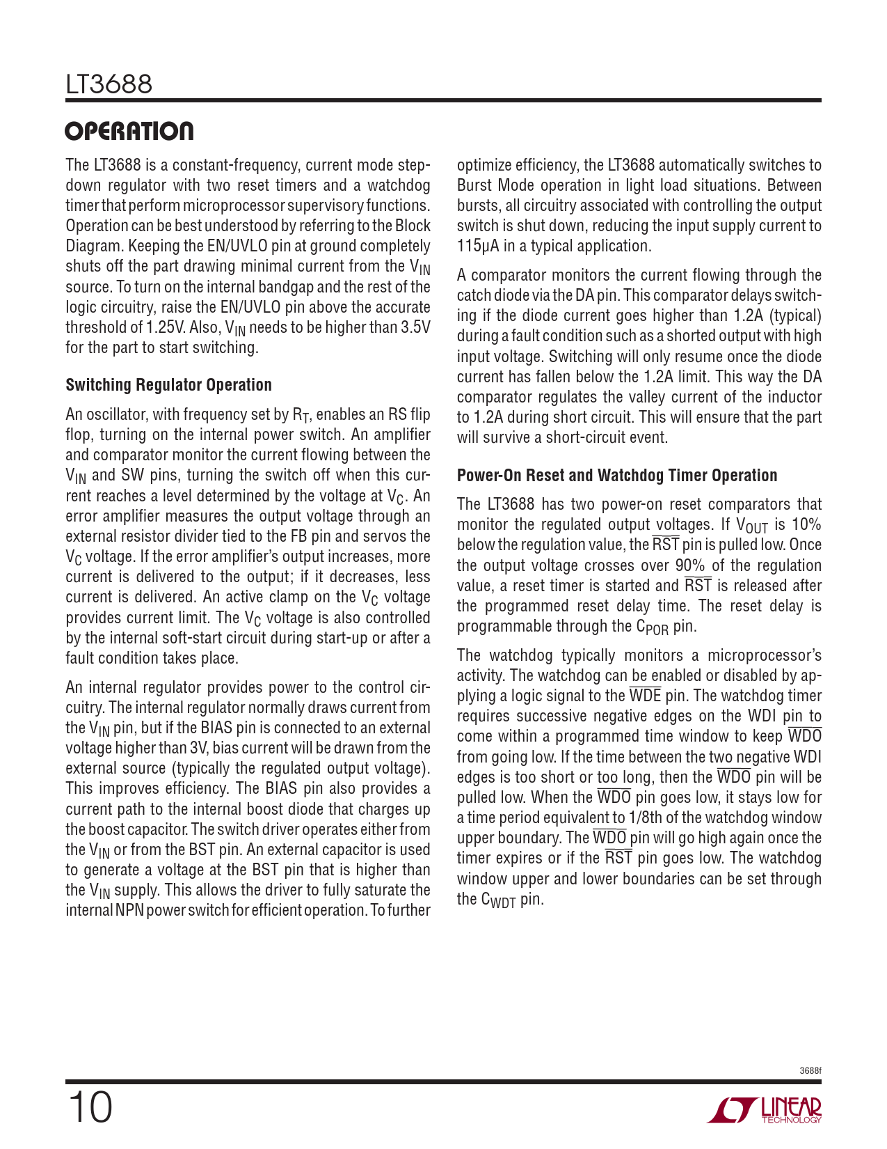 LT3688 OPERATION The LT3688 is a constant-frequency, current mode step- optimize effi ciency, the LT3688 automatically switches to down regulator with two reset timers and a watchdog Burst Mode operation in light load situations. Between timer that perform microprocessor supervisory functions. bursts, all circuitry associated with controlling the output Operation can be best understood by referring to the Block switch is shut down, reducing the input supply current to Diagram. Keeping the EN/UVLO pin at ground completely 115μA in a typical application. shuts off the part drawing minimal current from the VIN A comparator monitors the current fl owing through the source. To turn on the internal bandgap and the rest of the catch diode via the DA pin. This comparator delays switch- logic circuitry, raise the EN/UVLO pin above the accurate ing if the diode current goes higher than 1.2A (typical) threshold of 1.25V. Also, VIN needs to be higher than 3.5V during a fault condition such as a shorted output with high for the part to start switching. input voltage. Switching will only resume once the diode current has fallen below the 1.2A limit. This way the DA Switching Regulator Operation comparator regulates the valley current of the inductor An oscillator, with frequency set by RT, enables an RS fl ip to 1.2A during short circuit. This will ensure that the part fl op, turning on the internal power switch. An amplifi er will survive a short-circuit event. and comparator monitor the current fl owing between the VIN and SW pins, turning the switch off when this cur- Power-On Reset and Watchdog Timer Operation rent reaches a level determined by the voltage at VC. An The LT3688 has two power-on reset comparators that error amplifi er measures the output voltage through an monitor the regulated output voltages. If V external resistor divider tied to the FB pin and servos the OUT is 10% below the regulation value, the RST pin is pulled low. Once VC voltage. If the error amplifi er’s output increases, more the output voltage crosses over 90% of the regulation current is delivered to the output; if it decreases, less value, a reset timer is started and RST is released after current is delivered. An active clamp on the VC voltage the programmed reset delay time. The reset delay is provides current limit. The VC voltage is also controlled programmable through the C by the internal soft-start circuit during start-up or after a POR pin. fault condition takes place. The watchdog typically monitors a microprocessor’s activity. The watchdog can be enabled or disabled by ap- An internal regulator provides power to the control cir- plying a logic signal to the WDE pin. The watchdog timer cuitry. The internal regulator normally draws current from requires successive negative edges on the WDI pin to the VIN pin, but if the BIAS pin is connected to an external come within a programmed time window to keep WDO voltage higher than 3V, bias current will be drawn from the from going low. If the time between the two negative WDI external source (typically the regulated output voltage). edges is too short or too long, then the WDO pin will be This improves effi ciency. The BIAS pin also provides a pulled low. When the WDO pin goes low, it stays low for current path to the internal boost diode that charges up a time period equivalent to 1/8th of the watchdog window the boost capacitor. The switch driver operates either from upper boundary. The WDO pin will go high again once the the VIN or from the BST pin. An external capacitor is used timer expires or if the RST pin goes low. The watchdog to generate a voltage at the BST pin that is higher than window upper and lower boundaries can be set through the VIN supply. This allows the driver to fully saturate the the C internal NPN power switch for effi cient operation. To further WDT pin. 3688f 10