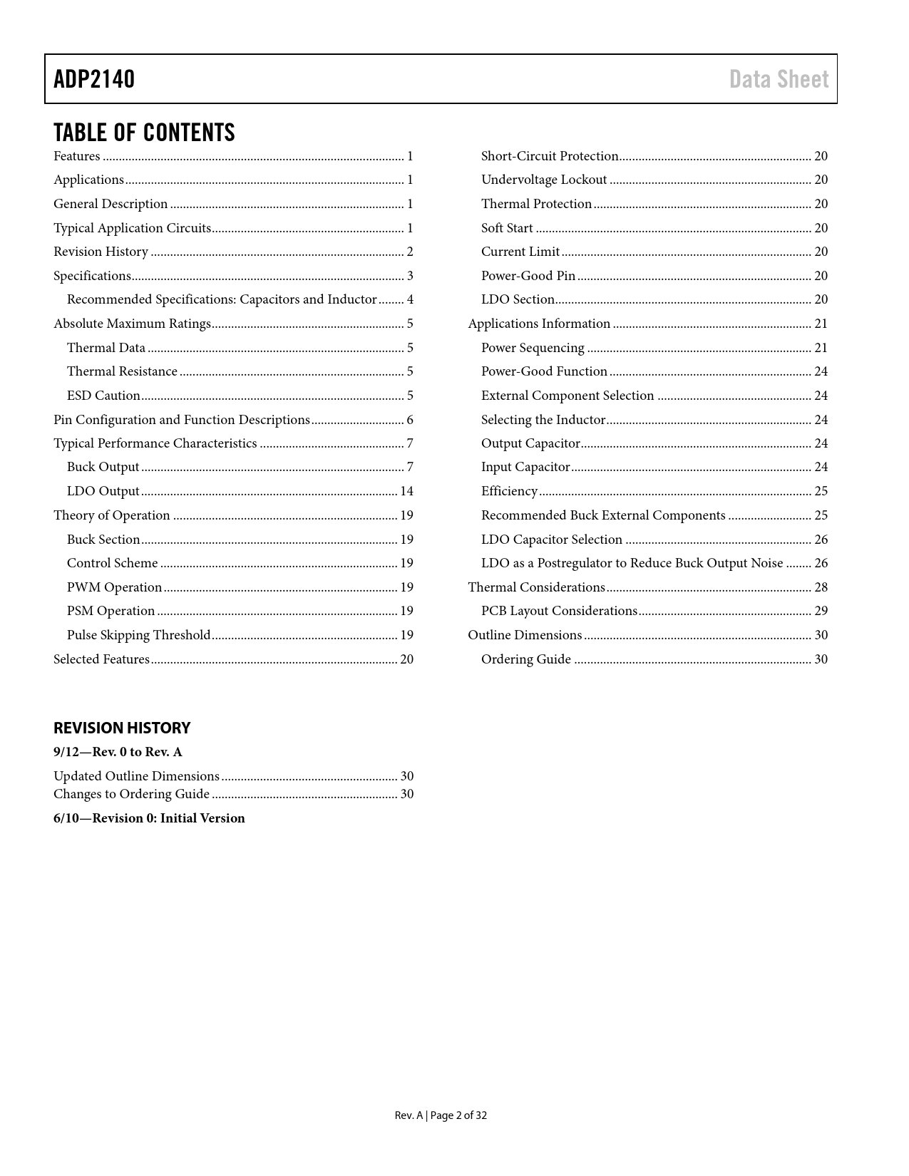 link to page 1 link to page 1 link to page 1 link to page 1 link to page 2 link to page 3 link to page 4 link to page 5 link to page 5 link to page 5 link to page 5 link to page 6 link to page 7 link to page 7 link to page 14 link to page 19 link to page 19 link to page 19 link to page 19 link to page 19 link to page 19 link to page 20 link to page 20 link to page 20 link to page 20 link to page 20 link to page 20 link to page 20 link to page 20 link to page 21 link to page 21 link to page 24 link to page 24 link to page 24 link to page 24 link to page 24 link to page 25 link to page 25 link to page 26 link to page 26 link to page 28 link to page 29 link to page 30 link to page 30 ADP2140Data SheetTABLE OF CONTENTS Features .. 1 Short-Circuit Protection.. 20 Applications ... 1 Undervoltage Lockout ... 20 General Description ... 1 Thermal Protection .. 20 Typical Application Circuits .. 1 Soft Start .. 20 Revision History ... 2 Current Limit .. 20 Specifications ... 3 Power-Good Pin ... 20 Recommended Specifications: Capacitors and Inductor .. 4 LDO Section.. 20 Absolute Maximum Ratings .. 5 Applications Information .. 21 Thermal Data .. 5 Power Sequencing .. 21 Thermal Resistance .. 5 Power-Good Function ... 24 ESD Caution .. 5 External Component Selection .. 24 Pin Configuration and Function Descriptions ... 6 Selecting the Inductor .. 24 Typical Performance Characteristics ... 7 Output Capacitor .. 24 Buck Output .. 7 Input Capacitor ... 24 LDO Output .. 14 Efficiency ... 25 Theory of Operation .. 19 Recommended Buck External Components .. 25 Buck Section .. 19 LDO Capacitor Selection .. 26 Control Scheme .. 19 LDO as a Postregulator to Reduce Buck Output Noise .. 26 PWM Operation ... 19 Thermal Considerations .. 28 PSM Operation ... 19 PCB Layout Considerations .. 29 Pulse Skipping Threshold .. 19 Outline Dimensions ... 30 Selected Features ... 20 Ordering Guide .. 30 REVISION HISTORY 9/12—Rev. 0 to Rev. A Updated Outline Dimensions ... 30 Changes to Ordering Guide .. 30 6/10—Revision 0: Initial Version Rev. A | Page 2 of 32 Document Outline Features Applications General Description Typical Application Circuits Revision History Specifications Recommended Specifications: Capacitors and Inductor Pin Configuration and Function Descriptions Typical Performance Characteristics Buck Output LDO Output Theory of Operation Buck Section Control Scheme PWM Operation PSM Operation Pulse Skipping Threshold Selected Features Short-Circuit Protection Undervoltage Lockout Thermal Protection Soft Start Current Limit Power-Good Pin LDO Section Applications Information Power Sequencing Power-Good Function External Component Selection Selecting the Inductor Output Capacitor Input Capacitor Efficiency Power Switch Conduction Losses Inductor Losses Switching Losses Transition Losses Recommended Buck External Components LDO Capacitor Selection Output Capacitor Input Bypass Capacitor Input and Output Capacitor Properties LDO as a Postregulator to Reduce Buck Output Noise Thermal Considerations PCB Layout Considerations Outline Dimensions Ordering Guide