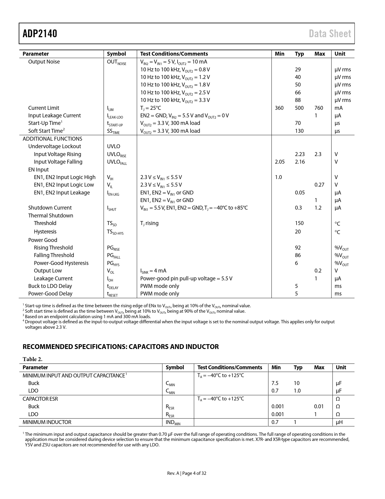 link to page 4 link to page 4 link to page 4 ADP2140Data SheetParameterSymbolTest Conditions/CommentsMinTypMaxUnit Output Noise OUT V = V = 5 V, I = 10 mA NOISE IN2 IN1 OUT2 10 Hz to 100 kHz, V = 0.8 V 29 µV rms OUT2 10 Hz to 100 kHz, V = 1.2 V 40 µV rms OUT2 10 Hz to 100 kHz, V = 1.8 V 50 µV rms OUT2 10 Hz to 100 kHz, V = 2.5 V 66 µV rms OUT2 10 Hz to 100 kHz, V = 3.3 V 88 µV rms OUT2 Current Limit I T = 25°C 360 500 760 mA LIM J Input Leakage Current I EN2 = GND, V = 5.5 V and V = 0 V 1 μA LEAK-LDO IN2 OUT2 Start-Up Time1 t V = 3.3 V, 300 mA load 70 µs START-UP OUT2 Soft Start Time2 SS V = 3.3 V, 300 mA load 130 μs TIME OUT2 ADDITIONAL FUNCTIONS Undervoltage Lockout UVLO Input Voltage Rising UVLO 2.23 2.3 V RISE Input Voltage Falling UVLO 2.05 2.16 V FALL EN Input EN1, EN2 Input Logic High V 2.3 V ≤ V ≤ 5.5 V 1.0 V IH IN1 EN1, EN2 Input Logic Low V 2.3 V ≤ V ≤ 5.5 V 0.27 V IL IN1 EN1, EN2 Input Leakage I EN1, EN2 = V or GND 0.05 µA EN-LKG IN1 EN1, EN2 = V or GND 1 µA IN1 Shutdown Current I V = 5.5 V, EN1, EN2 = GND, T = −40°C to +85°C 0.3 1.2 μA SHUT IN1 J Thermal Shutdown Threshold TS T rising 150 SD J °C Hysteresis TS 20 SD-HYS °C Power Good Rising Threshold PG 92 %V RISE OUT Falling Threshold PG 86 %V FALL OUT Power-Good Hysteresis PG 6 %V HYS OUT Output Low V I = 4 mA 0.2 V OL SINK Leakage Current I Power-good pin pull-up voltage = 5.5 V 1 μA OH Buck to LDO Delay t PWM mode only 5 ms DELAY Power-Good Delay t PWM mode only 5 ms RESET 1 Start-up time is defined as the time between the rising edge of ENx to VOUTx being at 10% of the VOUTx nominal value. 2 Soft start time is defined as the time between VOUTx being at 10% to VOUTx being at 90% of the VOUTx nominal value. 3 Based on an endpoint calculation using 1 mA and 300 mA loads. 4 Dropout voltage is defined as the input-to-output voltage differential when the input voltage is set to the nominal output voltage. This applies only for output voltages above 2.3 V. RECOMMENDED SPECIFICATIONS: CAPACITORS AND INDUCTORTable 2. ParameterSymbolTest Conditions/CommentsMinTypMaxUnit MINIMUM INPUT AND OUTPUT CAPACITANCE1 TA = −40°C to +125°C Buck C 7.5 10 µF MIN LDO C 0.7 1.0 µF MIN CAPACITOR ESR TA = −40°C to +125°C Ω Buck R 0.001 0.01 Ω ESR LDO R 0.001 1 Ω ESR MINIMUM INDUCTOR IND 0.7 1 μH MIN 1 The minimum input and output capacitance should be greater than 0.70 μF over the full range of operating conditions. The full range of operating conditions in the application must be considered during device selection to ensure that the minimum capacitance specification is met. X7R- and X5R-type capacitors are recommended, Y5V and Z5U capacitors are not recommended for use with any LDO. Rev. A | Page 4 of 32 Document Outline Features Applications General Description Typical Application Circuits Revision History Specifications Recommended Specifications: Capacitors and Inductor Pin Configuration and Function Descriptions Typical Performance Characteristics Buck Output LDO Output Theory of Operation Buck Section Control Scheme PWM Operation PSM Operation Pulse Skipping Threshold Selected Features Short-Circuit Protection Undervoltage Lockout Thermal Protection Soft Start Current Limit Power-Good Pin LDO Section Applications Information Power Sequencing Power-Good Function External Component Selection Selecting the Inductor Output Capacitor Input Capacitor Efficiency Power Switch Conduction Losses Inductor Losses Switching Losses Transition Losses Recommended Buck External Components LDO Capacitor Selection Output Capacitor Input Bypass Capacitor Input and Output Capacitor Properties LDO as a Postregulator to Reduce Buck Output Noise Thermal Considerations PCB Layout Considerations Outline Dimensions Ordering Guide