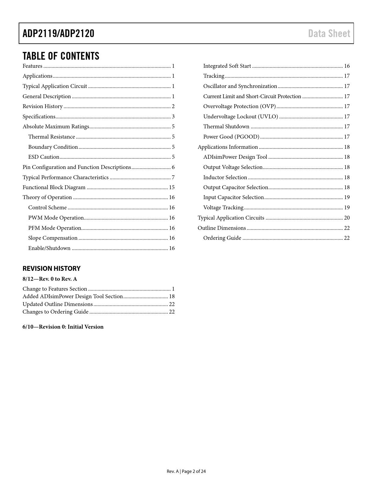 link to page 1 link to page 1 link to page 1 link to page 1 link to page 2 link to page 3 link to page 5 link to page 5 link to page 5 link to page 5 link to page 6 link to page 7 link to page 15 link to page 16 link to page 16 link to page 16 link to page 16 link to page 16 link to page 16 link to page 16 link to page 17 link to page 17 link to page 17 link to page 17 link to page 17 link to page 17 link to page 17 link to page 18 link to page 18 link to page 18 link to page 18 link to page 18 link to page 19 link to page 19 link to page 20 link to page 22 link to page 22 ADP2119/ADP2120Data SheetTABLE OF CONTENTS Features .. 1 Integrated Soft Start ... 16 Applications ... 1 Tracking ... 17 Typical Application Circuit ... 1 Oscillator and Synchronization .. 17 General Description ... 1 Current Limit and Short-Circuit Protection .. 17 Revision History ... 2 Overvoltage Protection (OVP) ... 17 Specifications ... 3 Undervoltage Lockout (UVLO) ... 17 Absolute Maximum Ratings .. 5 Thermal Shutdown .. 17 Thermal Resistance .. 5 Power Good (PGOOD) ... 17 Boundary Condition .. 5 Applications Information .. 18 ESD Caution .. 5 ADIsimPower Design Tool ... 18 Pin Configuration and Function Descriptions ... 6 Output Voltage Selection ... 18 Typical Performance Characteristics ... 7 Inductor Selection .. 18 Functional Block Diagram .. 15 Output Capacitor Selection... 18 Theory of Operation .. 16 Input Capacitor Selection .. 19 Control Scheme .. 16 Voltage Tracking ... 19 PWM Mode Operation .. 16 Typical Application Circuits ... 20 PFM Mode Operation .. 16 Outline Dimensions ... 22 Slope Compensation .. 16 Ordering Guide .. 22 Enable/Shutdown ... 16 REVISION HISTORY 8/12—Rev. 0 to Rev. A Change to Features Section ... 1 Added ADIsimPower Design Tool Section ... 18 Updated Outline Dimensions ... 22 Changes to Ordering Guide .. 22 6/10—Revision 0: Initial Version Rev. A | Page 2 of 24 Document Outline Features Applications Typical Application Circuit General Description Revision History Specifications Absolute Maximum Ratings Thermal Resistance Boundary Condition ESD Caution Pin Configuration and Function Descriptions Typical Performance Characteristics Functional Block Diagram Theory of Operation Control Scheme PWM Mode Operation PFM Mode Operation Slope Compensation Enable/Shutdown Integrated Soft Start Tracking Oscillator and Synchronization Current Limit and Short-Circuit Protection Overvoltage Protection (OVP) Undervoltage Lockout (UVLO) Thermal Shutdown Power Good (PGOOD) Applications Information ADIsimPower Design Tool Output Voltage Selection Inductor Selection Output Capacitor Selection Input Capacitor Selection Voltage Tracking Typical Application Circuits Outline Dimensions Ordering Guide