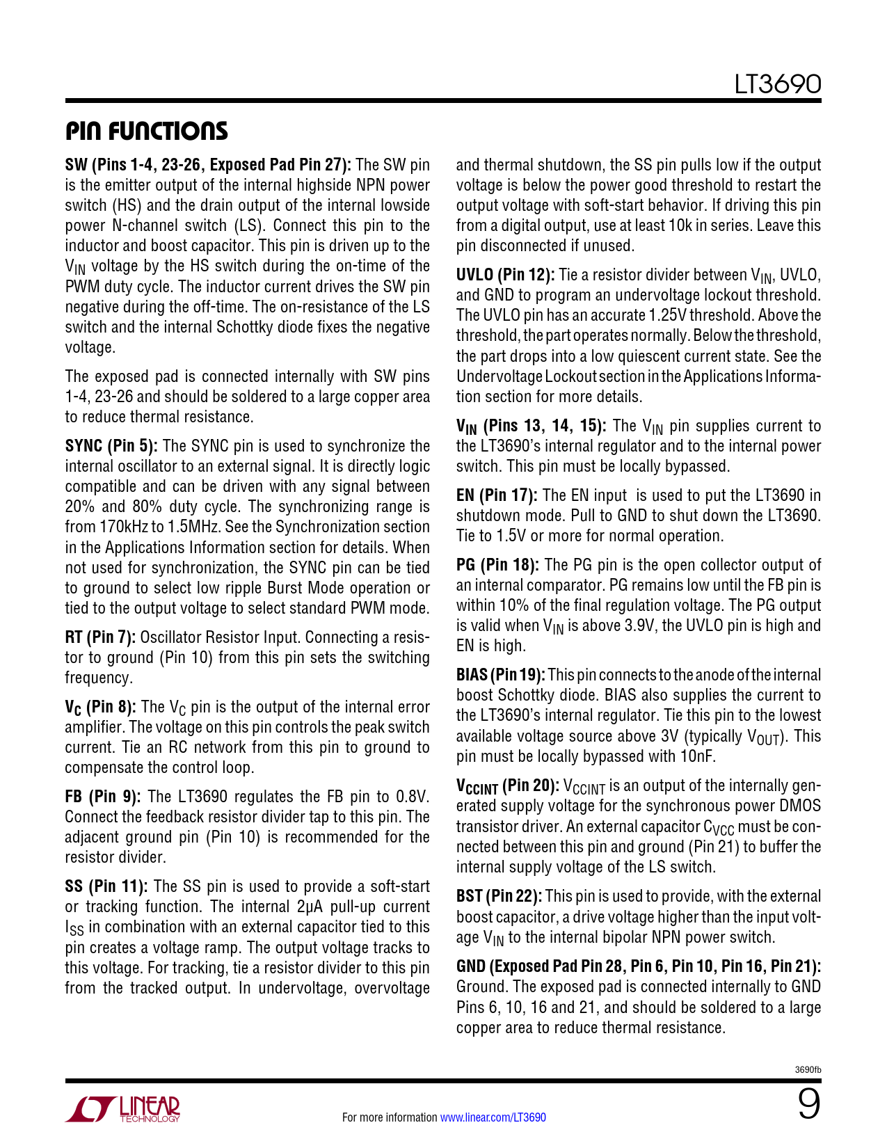 LT3690 pin FuncTions SW (Pins 1-4, 23-26, Exposed Pad Pin 27): The SW pin and thermal shutdown, the SS pin pulls low if the output is the emitter output of the internal highside NPN power voltage is below the power good threshold to restart the switch (HS) and the drain output of the internal lowside output voltage with soft-start behavior. If driving this pin power N-channel switch (LS). Connect this pin to the from a digital output, use at least 10k in series. Leave this inductor and boost capacitor. This pin is driven up to the pin disconnected if unused. VIN voltage by the HS switch during the on-time of the UVLO (Pin 12): Tie a resistor divider between V PWM duty cycle. The inductor current drives the SW pin IN, UVLO, and GND to program an undervoltage lockout threshold. negative during the off-time. The on-resistance of the LS The UVLO pin has an accurate 1.25V threshold. Above the switch and the internal Schottky diode fixes the negative threshold, the part operates normally. Below the threshold, voltage. the part drops into a low quiescent current state. See the The exposed pad is connected internally with SW pins Undervoltage Lockout section in the Applications Informa- 1-4, 23-26 and should be soldered to a large copper area tion section for more details. to reduce thermal resistance. VIN (Pins 13, 14, 15): The VIN pin supplies current to SYNC (Pin 5): The SYNC pin is used to synchronize the the LT3690’s internal regulator and to the internal power internal oscillator to an external signal. It is directly logic switch. This pin must be locally bypassed. compatible and can be driven with any signal between EN (Pin 17): The EN input is used to put the LT3690 in 20% and 80% duty cycle. The synchronizing range is shutdown mode. Pull to GND to shut down the LT3690. from 170kHz to 1.5MHz. See the Synchronization section Tie to 1.5V or more for normal operation. in the Applications Information section for details. When not used for synchronization, the SYNC pin can be tied PG (Pin 18): The PG pin is the open collector output of to ground to select low ripple Burst Mode operation or an internal comparator. PG remains low until the FB pin is tied to the output voltage to select standard PWM mode. within 10% of the final regulation voltage. The PG output is valid when V RT (Pin 7): Oscillator Resistor Input. Connecting a resis- IN is above 3.9V, the UVLO pin is high and EN is high. tor to ground (Pin 10) from this pin sets the switching frequency. BIAS (Pin 19): This pin connects to the anode of the internal boost Schottky diode. BIAS also supplies the current to VC (Pin 8): The VC pin is the output of the internal error the LT3690’s internal regulator. Tie this pin to the lowest amplifier. The voltage on this pin controls the peak switch available voltage source above 3V (typically V current. Tie an RC network from this pin to ground to OUT). This pin must be locally bypassed with 10nF. compensate the control loop. VFB (Pin 9): The LT3690 regulates the FB pin to 0.8V. CCINT (Pin 20): VCCINT is an output of the internally gen- erated supply voltage for the synchronous power DMOS Connect the feedback resistor divider tap to this pin. The transistor driver. An external capacitor C adjacent ground pin (Pin 10) is recommended for the VCC must be con- resistor divider. nected between this pin and ground (Pin 21) to buffer the internal supply voltage of the LS switch. SS (Pin 11): The SS pin is used to provide a soft-start or tracking function. The internal 2µA pull-up current BST (Pin 22): This pin is used to provide, with the external I boost capacitor, a drive voltage higher than the input volt- SS in combination with an external capacitor tied to this pin creates a voltage ramp. The output voltage tracks to age VIN to the internal bipolar NPN power switch. this voltage. For tracking, tie a resistor divider to this pin GND (Exposed Pad Pin 28, Pin 6, Pin 10, Pin 16, Pin 21): from the tracked output. In undervoltage, overvoltage Ground. The exposed pad is connected internally to GND Pins 6, 10, 16 and 21, and should be soldered to a large copper area to reduce thermal resistance. 3690fb For more information www.linear.com/LT3690 9 Document Outline Features Applications Description Typical Application Absolute Maximum Ratings Pin Configuration Order Information Electrical Characteristics Typical Performance Characteristics Pin Functions Block Diagram Operation Applications Information Typical Applications Package Description Revision History Typical Application Related Parts