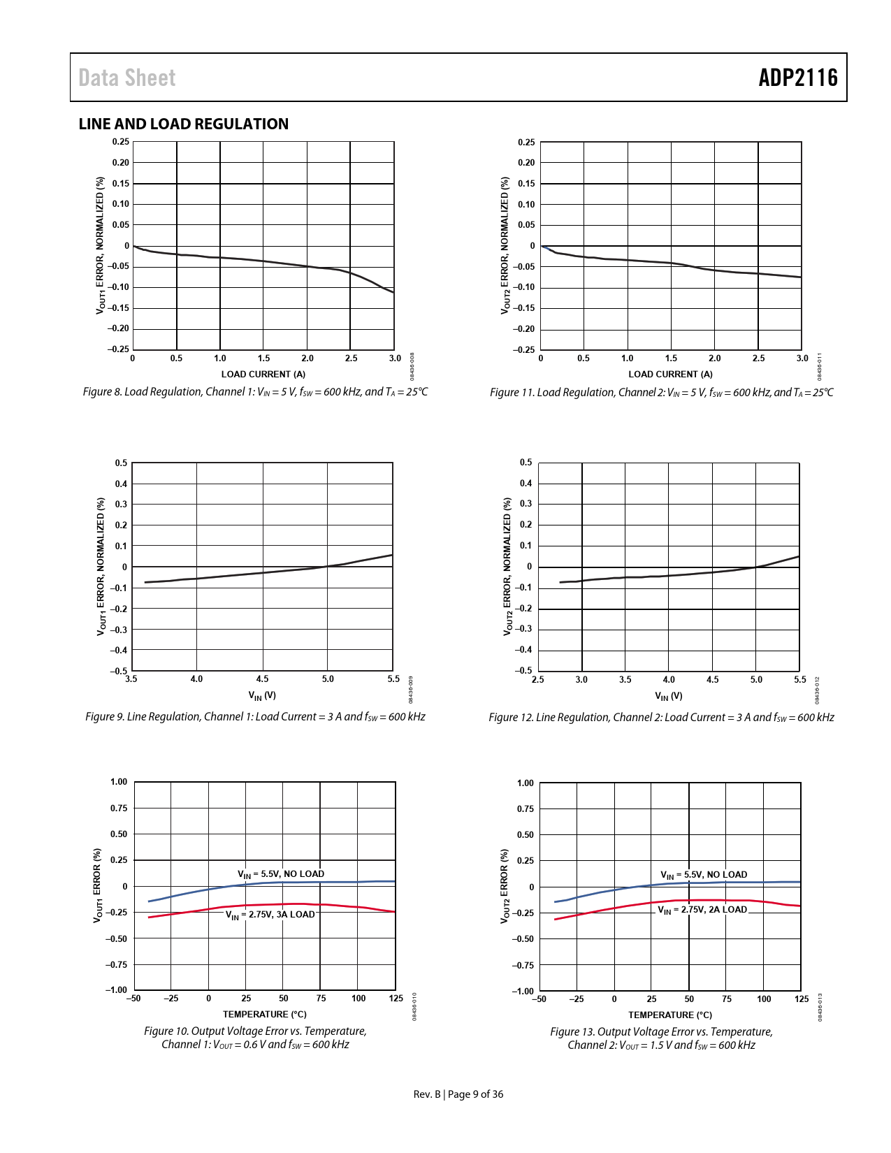 Datasheet ADP2116 (Analog Devices) - 9 Manufacturer Analog Devices Description Configurable, Dual 3 A/Single 6 A, Synchronous, Step-Down DC-to-DC Regulator Pages / Page 36 / 9 — Data Sheet. ADP2116. LINE AND LOAD REGULATION. 0.25. 0.20. % 0.15. 0.15. … Revision B File Format / Size PDF / 2.9 Mb Document Language English