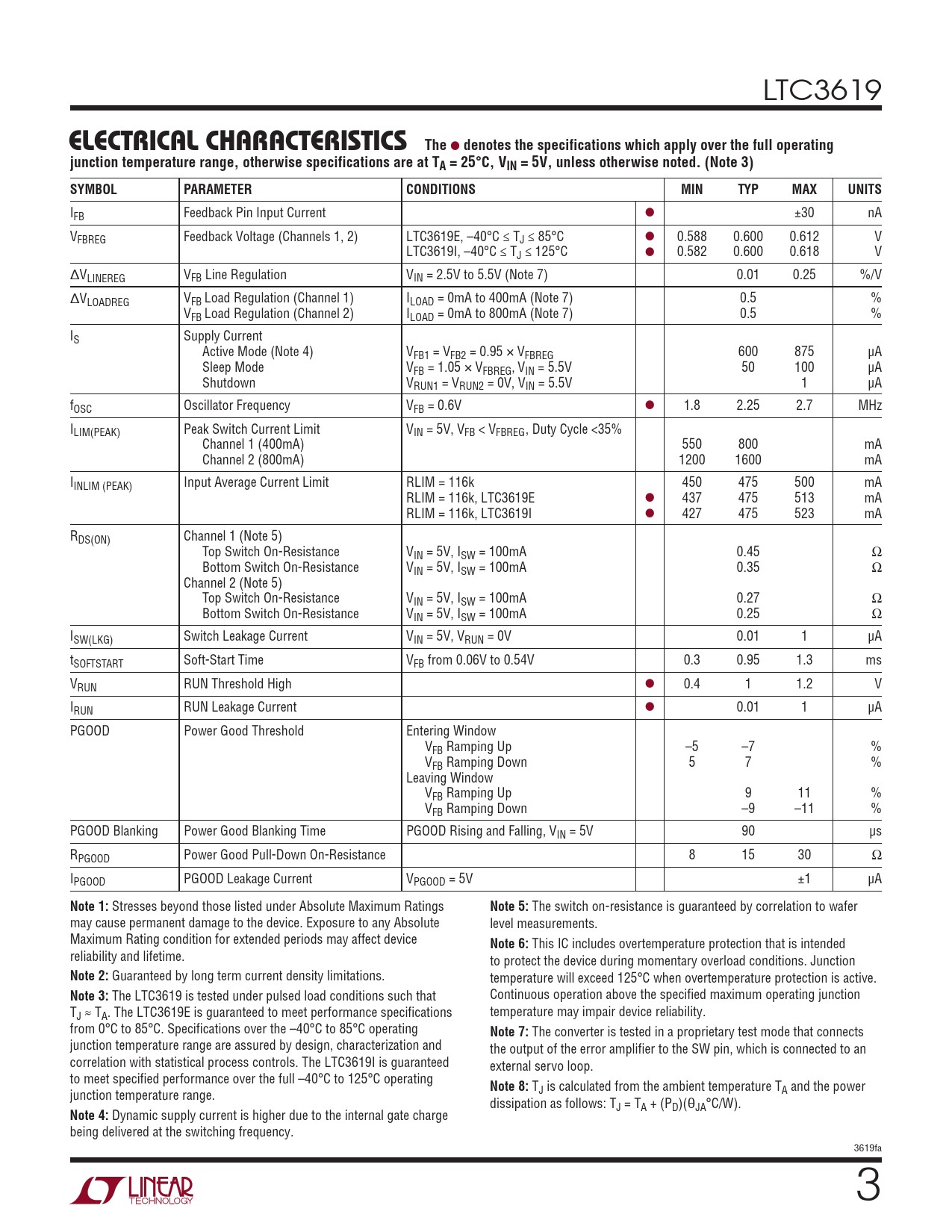 IFB Feedback Pin Input Current l ±30 nA VFBREG Feedback Voltage (Channels 1, 2) LTC3619E, –40°C ≤ TJ ≤ 85°C l 0.588 0.600 0.612 V LTC3619I, –40°C ≤ TJ ≤ 125°C l 0.582 0.600 0.618 V ΔVLINEREG VFB Line Regulation VIN = 2.5V to 5.5V (Note 7) 0.01 0.25 %/V ΔVLOADREG VFB Load Regulation (Channel 1) ILOAD = 0mA to 400mA (Note 7) 0.5 % VFB Load Regulation (Channel 2) ILOAD = 0mA to 800mA (Note 7) 0.5 % IS Supply Current Active Mode (Note 4) VFB1 = VFB2 = 0.95 × VFBREG 600 875 µA Sleep Mode VFB = 1.05 × VFBREG, VIN = 5.5V 50 100 µA Shutdown VRUN1 = VRUN2 = 0V, VIN = 5.5V 1 µA fOSC Oscillator Frequency VFB = 0.6V l 1.8 2.25 2.7 MHz ILIM(PEAK) Peak Switch Current Limit VIN = 5V, VFB < VFBREG, Duty Cycle <35% Channel 1 (400mA) 550 800 mA Channel 2 (800mA) 1200 1600 mA IINLIM (PEAK) Input Average Current Limit RLIM = 116k 450 475 500 mA RLIM = 116k, LTC3619E l 437 475 513 mA RLIM = 116k, LTC3619I l 427 475 523 mA RDS(ON) Channel 1 (Note 5) Top Switch On-Resistance VIN = 5V, ISW = 100mA 0.45 Ω Bottom Switch On-Resistance VIN = 5V, ISW = 100mA 0.35 Ω Channel 2 (Note 5) Top Switch On-Resistance VIN = 5V, ISW = 100mA 0.27 Ω Bottom Switch On-Resistance VIN = 5V, ISW = 100mA 0.25 Ω ISW(LKG) Switch Leakage Current VIN = 5V, VRUN = 0V 0.01 1 µA tSOFTSTART Soft-Start Time VFB from 0.06V to 0.54V 0.3 0.95 1.3 ms VRUN RUN Threshold High l 0.4 1 1.2 V IRUN RUN Leakage Current l 0.01 1 µA PGOOD Power Good Threshold Entering Window VFB Ramping Up –5 –7 % VFB Ramping Down 5 7 % Leaving Window VFB Ramping Up 9 11 % VFB Ramping Down –9 –11 % PGOOD Blanking Power Good Blanking Time PGOOD Rising and Falling, VIN = 5V 90 µs RPGOOD Power Good Pull-Down On-Resistance 8 15 30 Ω IPGOOD PGOOD Leakage Current VPGOOD = 5V ±1 µA
