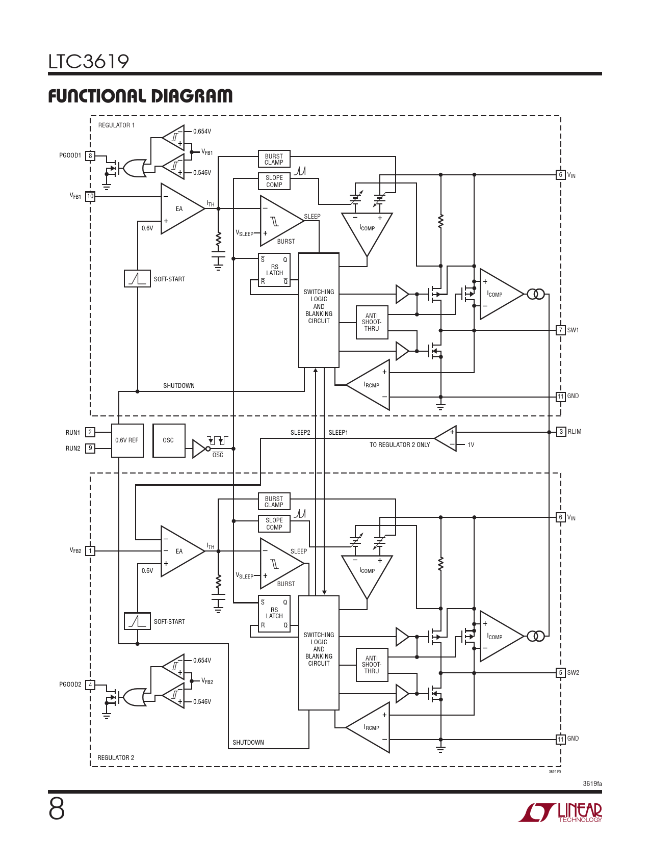 REGULATOR 1 – 0.654V + V PGOOD1 8 FB1 – BURST CLAMP + 0.546V SLOPE 6 VIN COMP VFB1 10 – ITH EA – + SLEEP – + 0.6V I V COMP SLEEP + BURST S Q RS LATCH SOFT-START R Q + SWITCHING ICOMP LOGIC AND – BLANKING ANTI CIRCUIT SHOOT- THRU 7 SW1 + I SHUTDOWN RCMP – 11 GND RUN1 2 SLEEP2 SLEEP1 + 3 RLIM 0.6V REF OSC TO REGULATOR 2 ONLY – 1V RUN2 9 OSC BURST CLAMP SLOPE 6 VIN COMP – VFB2 1 – ITH EA – SLEEP + – + 0.6V I V COMP SLEEP + BURST S Q RS LATCH SOFT-START R Q + SWITCHING ICOMP LOGIC AND – – BLANKING ANTI 0.654V CIRCUIT SHOOT- + THRU 5 SW2 V PGOOD2 4 FB2 – + 0.546V + IRCMP – SHUTDOWN 11 GND REGULATOR 2 3619 FD 3619fa 8 Document Outline Description Typical Application Absolute Maximum Ratings Pin Configuration Order Information Electrical Characteristics Typical Performance Characteristics Functional Diagram Operation Applications Information Package Description Typical Application Related Parts