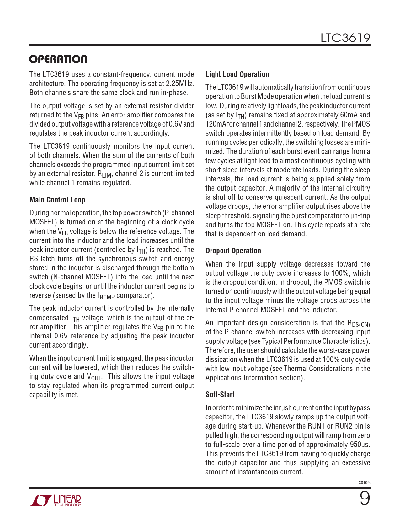In order to minimize the inrush current on the input bypass capacitor, the LTC3619 slowly ramps up the output volt- age during start-up. Whenever the RUN1 or RUN2 pin is pulled high, the corresponding output will ramp from zero to full-scale over a time period of approximately 950µs. This prevents the LTC3619 from having to quickly charge the output capacitor and thus supplying an excessive amount of instantaneous current. 3619fa 9 Document Outline Description Typical Application Absolute Maximum Ratings Pin Configuration Order Information Electrical Characteristics Typical Performance Characteristics Functional Diagram Operation Applications Information Package Description Typical Application Related Parts