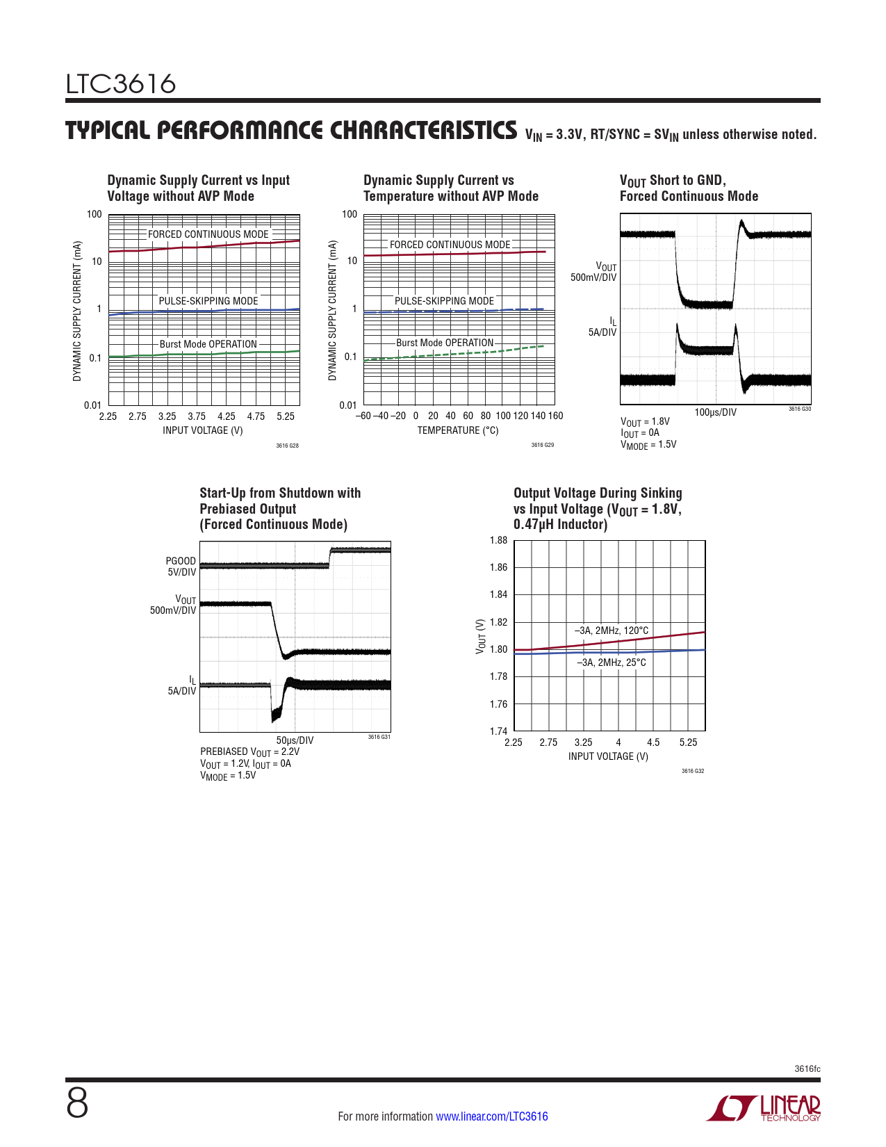 1.88 PGOOD 5V/DIV 1.86 V 1.84 OUT 500mV/DIV 1.82 (V) –3A, 2MHz, 120°C V OUT 1.80 –3A, 2MHz, 25°C IL 1.78 5A/DIV 1.76 1.74 50µs/DIV 3616 G31 2.25 2.75 3.25 4 4.5 5.25 PREBIASED VOUT = 2.2V INPUT VOLTAGE (V) VOUT = 1.2V, IOUT = 0A V 3616 G32 MODE = 1.5V 3616fc 8 For more information www.linear.com/LTC3616 Document Outline Features Applications Description Typical Application Absolute Maximum Ratings Pin Configuration Order Information Electrical Characteristics Typical Performance Characteristics Pin Functions Functional Block Diagram Operation Applications Information Typical Applications Package Description Revision History Typical Application Related Parts