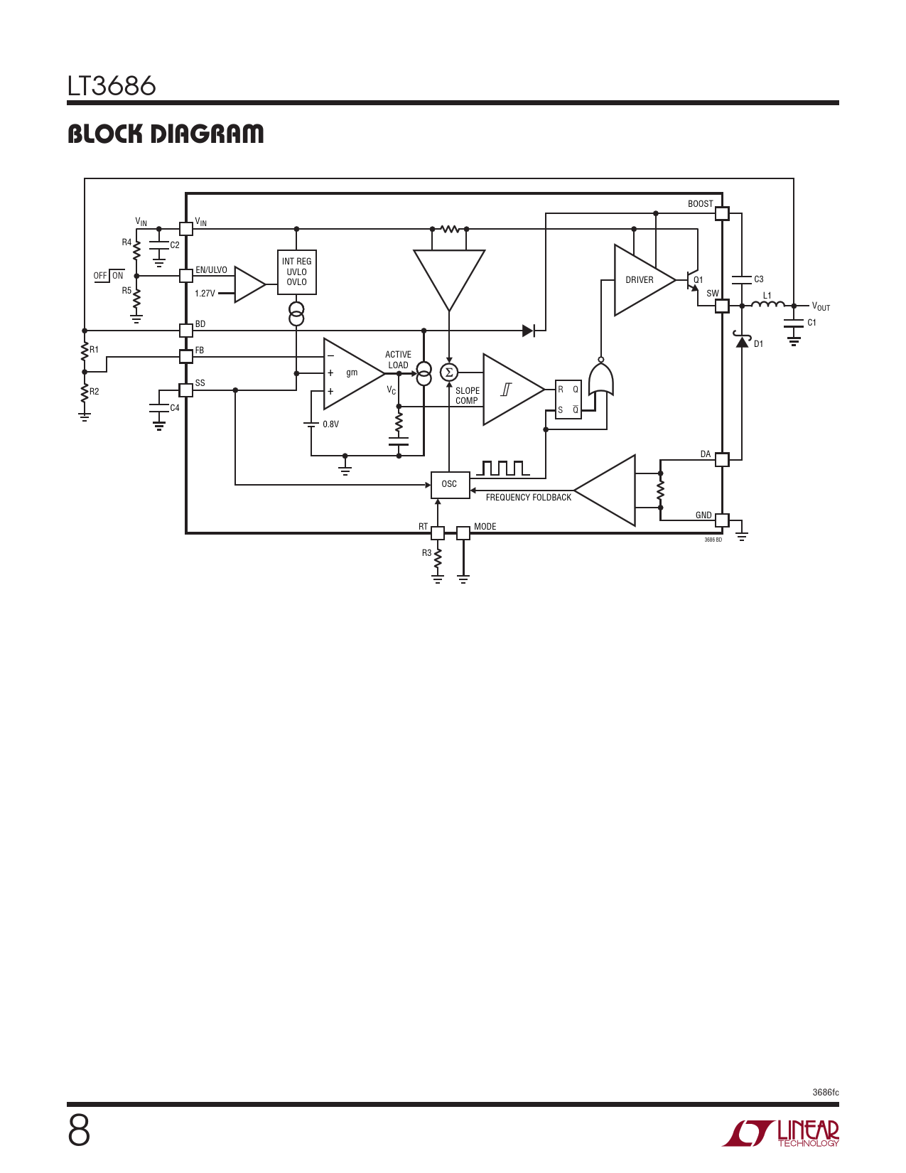 BOOST VIN VIN R4 C2 INT REG EN/ULVO UVLO OFF ON OVLO DRIVER Q1 C3 R5 1.27V SW L1 VOUT BD C1 D1 R1 FB – ACTIVE LOAD + gm SS R2 + VC SLOPE R Q COMP C4 S Q 0.8V DA OSC FREQUENCY FOLDBACK GND RT MODE 3686 BD R3 3686fc 8 Document Outline Features Applications Description Typical Application Absolute Maximum Ratings Pin Configuration Order Information Electrical Characteristics Typical Performance Characteristics Pin Functions Block Diagram Operation Applications Information Typical Applications Package Description Revision History Related Parts