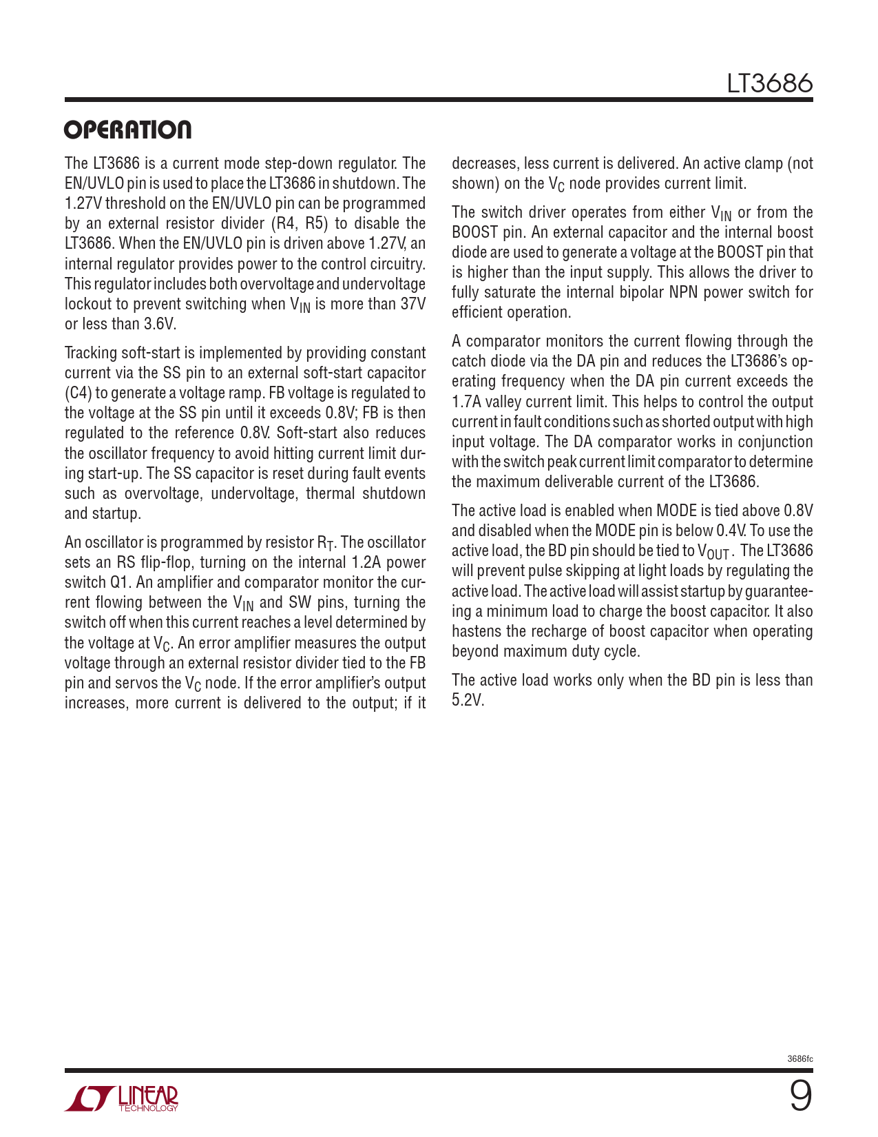 LT3686 operAtion The LT3686 is a current mode step-down regulator. The decreases, less current is delivered. An active clamp (not EN/UVLO pin is used to place the LT3686 in shutdown. The shown) on the VC node provides current limit. 1.27V threshold on the EN/UVLO pin can be programmed The switch driver operates from either V by an external resistor divider (R4, R5) to disable the IN or from the BOOST pin. An external capacitor and the internal boost LT3686. When the EN/UVLO pin is driven above 1.27V, an diode are used to generate a voltage at the BOOST pin that internal regulator provides power to the control circuitry. is higher than the input supply. This allows the driver to This regulator includes both overvoltage and undervoltage fully saturate the internal bipolar NPN power switch for lockout to prevent switching when VIN is more than 37V efficient operation. or less than 3.6V. A comparator monitors the current flowing through the Tracking soft-start is implemented by providing constant catch diode via the DA pin and reduces the LT3686’s op- current via the SS pin to an external soft-start capacitor erating frequency when the DA pin current exceeds the (C4) to generate a voltage ramp. FB voltage is regulated to 1.7A valley current limit. This helps to control the output the voltage at the SS pin until it exceeds 0.8V; FB is then current in fault conditions such as shorted output with high regulated to the reference 0.8V. Soft-start also reduces input voltage. The DA comparator works in conjunction the oscillator frequency to avoid hitting current limit dur- with the switch peak current limit comparator to determine ing start-up. The SS capacitor is reset during fault events the maximum deliverable current of the LT3686. such as overvoltage, undervoltage, thermal shutdown and startup. The active load is enabled when MODE is tied above 0.8V and disabled when the MODE pin is below 0.4V. To use the An oscillator is programmed by resistor RT. The oscillator active load, the BD pin should be tied to V sets an RS flip-flop, turning on the internal 1.2A power OUT . The LT3686 will prevent pulse skipping at light loads by regulating the switch Q1. An amplifier and comparator monitor the cur- active load. The active load will assist startup by guarantee- rent flowing between the VIN and SW pins, turning the ing a minimum load to charge the boost capacitor. It also switch off when this current reaches a level determined by hastens the recharge of boost capacitor when operating the voltage at VC. An error amplifier measures the output beyond maximum duty cycle. voltage through an external resistor divider tied to the FB pin and servos the VC node. If the error amplifier’s output The active load works only when the BD pin is less than increases, more current is delivered to the output; if it 5.2V. 3686fc 9 Document Outline Features Applications Description Typical Application Absolute Maximum Ratings Pin Configuration Order Information Electrical Characteristics Typical Performance Characteristics Pin Functions Block Diagram Operation Applications Information Typical Applications Package Description Revision History Related Parts