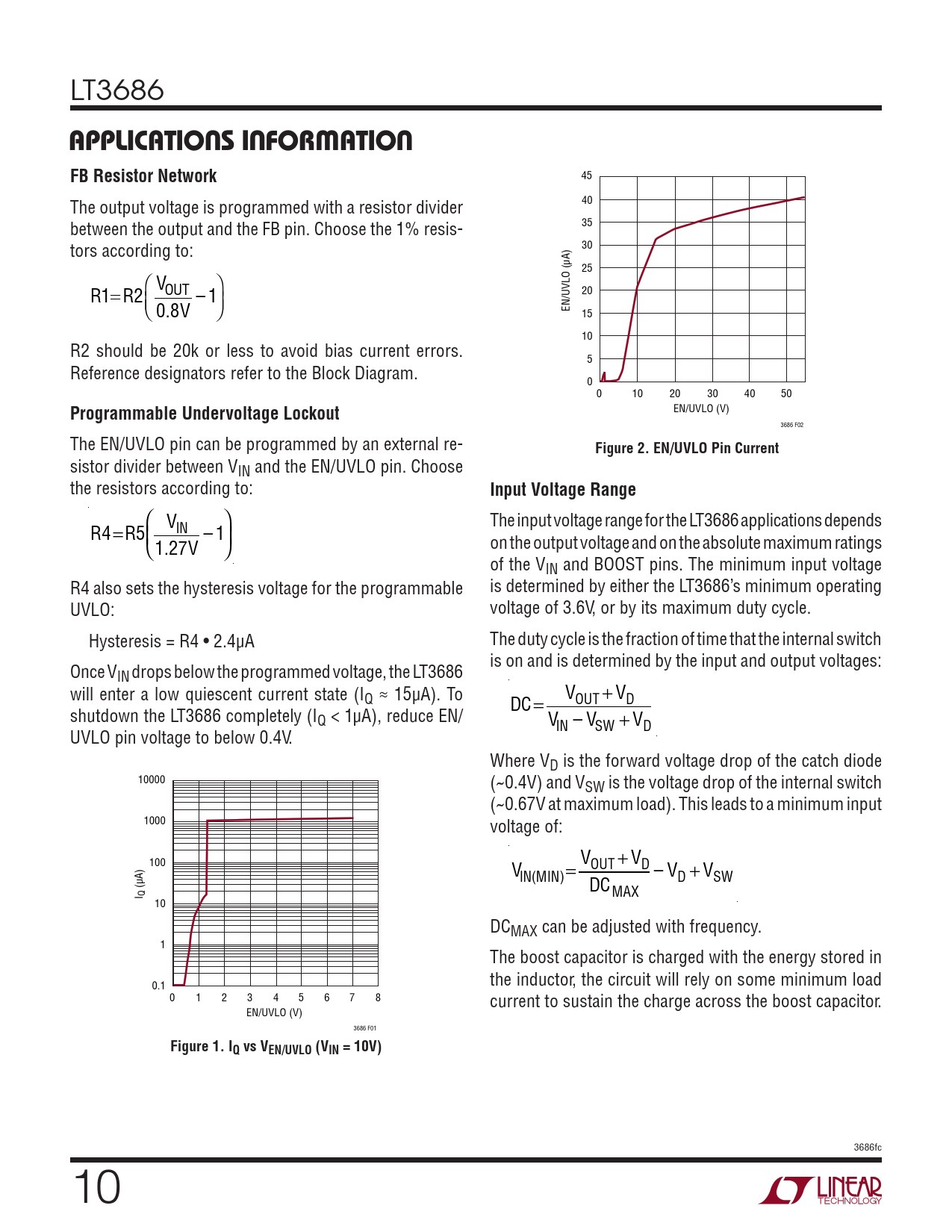  V  The input voltage range for the LT3686 applications depends R4=R5 IN  – 1 on the output voltage and on the absolute maximum ratings 1.27V  of the VIN and BOOST pins. The minimum input voltage R4 also sets the hysteresis voltage for the programmable is determined by either the LT3686’s minimum operating UVLO: voltage of 3.6V, or by its maximum duty cycle. Hysteresis = R4 • 2.4µA The duty cycle is the fraction of time that the internal switch is on and is determined by the input and output voltages: Once VIN drops below the programmed voltage, the LT3686 will enter a low quiescent current state (I V Q ≈ 15µA). To DC= OUT + VD shutdown the LT3686 completely (IQ < 1µA), reduce EN/ VIN – VSW + VD UVLO pin voltage to below 0.4V. Where VD is the forward voltage drop of the catch diode 10000 (~0.4V) and VSW is the voltage drop of the internal switch (~0.67V at maximum load). This leads to a minimum input 1000 voltage of: 100 V V OUT + VD IN(MIN)= – VD + VSW (µA) I Q DCMAX 10 DCMAX can be adjusted with frequency. 1 The boost capacitor is charged with the energy stored in 0.1 the inductor, the circuit will rely on some minimum load 0 1 2 3 4 5 6 7 8 current to sustain the charge across the boost capacitor. EN/UVLO (V) 3686 F01