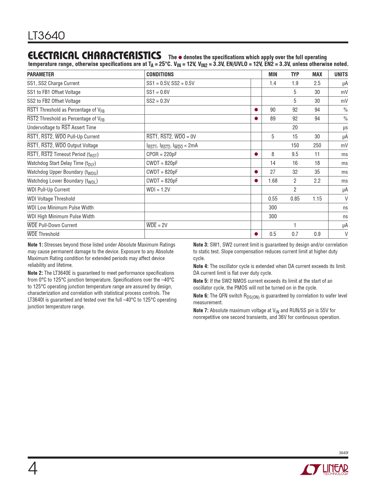 LT3640 elecTrical characTerisTics The l denotes the specifications which apply over the full operatingtemperature range, otherwise specifications are at TA = 25°C. VIN = 12V, VIN2 = 3.3V, EN/UVLO = 12V, EN2 = 3.3V, unless otherwise noted.PARAMETERCONDITIONSMINTYPMAXUNITS SS1, SS2 Charge Current SS1 = 0.5V, SS2 = 0.5V 1.4 1.9 2.5 µA SS1 to FB1 Offset Voltage SS1 = 0.6V 5 30 mV SS2 to FB2 Offset Voltage SS2 = 0.3V 5 30 mV RST1 Threshold as Percentage of VFB l 90 92 94 % RST2 Threshold as Percentage of VFB l 89 92 94 % Undervoltage to RST Assert Time 20 µs RST1, RST2, WDO Pull-Up Current RST1, RST2, WDO = 0V 5 15 30 µA RST1, RST2, WDO Output Voltage IRST1, IRST2, IWDO = 2mA 150 250 mV RST1, RST2 Timeout Period (tRST) CPOR = 220pF l 8 9.5 11 ms Watchdog Start Delay Time (tDLY) CWDT = 820pF 14 16 18 ms Watchdog Upper Boundary (tWDU) CWDT = 820pF l 27 32 35 ms Watchdog Lower Boundary (tWDL) CWDT = 820pF l 1.68 2 2.2 ms WDI Pull-Up Current WDI = 1.2V 2 µA WDI Voltage Threshold 0.55 0.85 1.15 V WDI Low Minimum Pulse Width 300 ns WDI High Minimum Pulse Width 300 ns WDE Pull-Down Current WDE = 2V 1 µA WDE Threshold l 0.5 0.7 0.9 V Note 1: Stresses beyond those listed under Absolute Maximum Ratings Note 3: SW1, SW2 current limit is guaranteed by design and/or correlation may cause permanent damage to the device. Exposure to any Absolute to static test. Slope compensation reduces current limit at higher duty Maximum Rating condition for extended periods may affect device cycle. reliability and lifetime. Note 4: The oscillator cycle is extended when DA current exceeds its limit. Note 2: The LT3640E is guaranteed to meet performance specifications DA current limit is flat over duty cycle. from 0°C to 125°C junction temperature. Specifications over the –40°C Note 5: If the SW2 NMOS current exceeds its limit at the start of an to 125°C operating junction temperature range are assured by design, oscillator cycle, the PMOS will not be turned on in the cycle. characterization and correlation with statistical process controls. The Note 6: The QFN switch R LT3640I is guaranteed and tested over the full –40°C to 125°C operating DS(ON) is guaranteed by correlation to wafer level measurement. junction temperature range. Note 7: Absolute maximum voltage at VIN and RUN/SS pin is 55V for nonrepetitive one second transients, and 36V for continuous operation. 3640f Document Outline Features Applications Description Typical Application Absolute Maximum Ratings Pin Configuration Order Information Electrical Characteristics Typical Performance Characteristics Pin Functions Block Diagram Timing Diagrams Operation Applications Information Typical Applications Package Description Typical Application Related Parts
