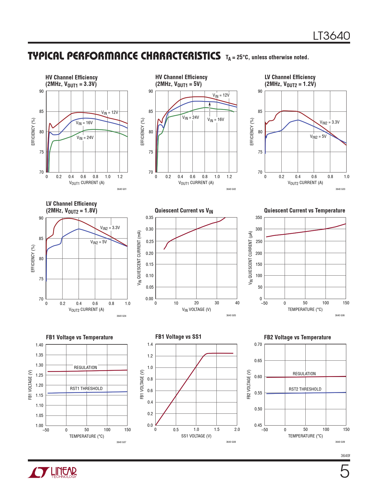 90 90 90 VIN = 12V 85 VIN = 12V 85 85 VIN = 24V V V IN = 16V IN = 16V VIN2 = 3.3V 80 80 80 V V IN = 24V IN2 = 5V EFFICIENCY (%) EFFICIENCY (%) EFFICIENCY (%) 75 75 75 70 70 70 0 0.2 0.4 0.6 0.8 1.0 1.2 0 0.2 0.4 0.6 0.8 1.0 1.2 0 0.2 0.4 0.6 0.8 1.0 VOUT1 CURRENT (A) VOUT1 CURRENT (A) VOUT2 CURRENT (A) 3640 G01 3640 G02 3640 G03
