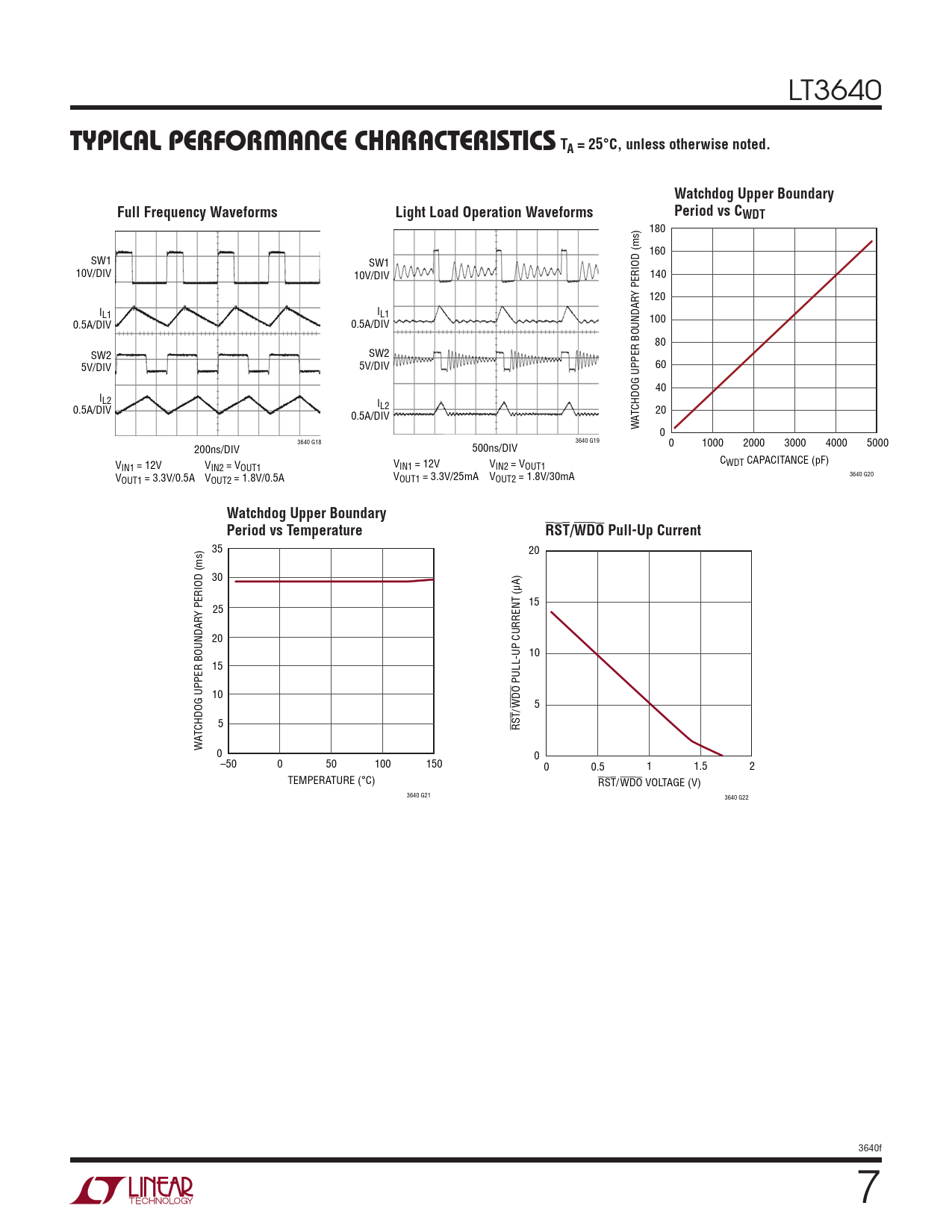 180 160 SW1 SW1 10V/DIV 10V/DIV 140 Y PERIOD (ms) 120 IL1 IL1 0.5A/DIV 0.5A/DIV 100 80 SW2 SW2 5V/DIV 5V/DIV 60 40 IL2 I 0.5A/DIV L2 0.5A/DIV 20 ATCHDOG UPPER BOUNDAR W 0 3640 G18 3640 G19 200ns/DIV 500ns/DIV 0 1000 2000 3000 4000 5000 V C IN1 = 12V VIN2 = VOUT1 VIN1 = 12V VIN2 = VOUT1 WDT CAPACITANCE (pF) V 3640 G20 OUT1 = 3.3V/0.5A VOUT2 = 1.8V/0.5A VOUT1 = 3.3V/25mA VOUT2 = 1.8V/30mA