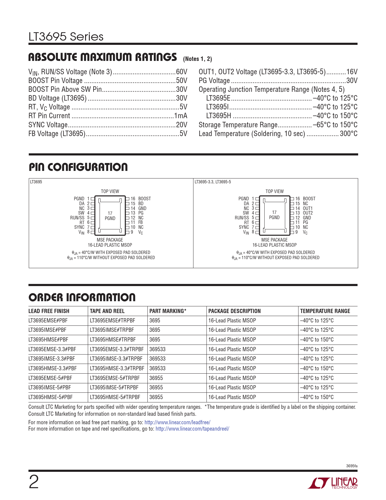 LT3695 Series ABSOLUTE MAXIMUM RATINGS (Notes 1, 2) VIN, RUN/SS Voltage (Note 3) ...60V OUT1, OUT2 Voltage (LT3695-3.3, LT3695-5) ...16V BOOST Pin Voltage ...50V PG Voltage ..30V BOOST Pin Above SW Pin ...30V Operating Junction Temperature Range (Notes 4, 5) BD Voltage (LT3695) ...30V LT3695E ... –40°C to 125°C RT , VC Voltage ..5V LT3695I .. –40°C to 125°C RT Pin Current ...1mA LT3695H .. –40°C to 150°C SYNC Voltage ..20V Storage Temperature Range ... –65°C to 150°C FB Voltage (LT3695) ..5V Lead Temperature (Soldering, 10 sec) .. 300°C PIN CONFIGURATION LT3695 LT3695-3.3, LT3695-5 TOP VIEW TOP VIEW PGND 1 16 BOOST PGND 1 16 BOOST DA 2 15 BD DA 2 15 NC NC 3 14 GND NC 3 14 OUT1 SW 4 17 13 PG SW 4 17 13 OUT2 RUN/SS 5 PGND 12 NC RUN/SS 5 PGND 12 GND RT 6 11 FB RT 6 11 PG SYNC 7 10 NC SYNC 7 10 NC V 8 IN 9 VC V 8 IN 9 VC MSE PACKAGE MSE PACKAGE 16-LEAD PLASTIC MSOP 16-LEAD PLASTIC MSOP θJA = 40°C/W WITH EXPOSED PAD SOLDERED θJA = 40°C/W WITH EXPOSED PAD SOLDERED θJA = 110°C/W WITHOUT EXPOSED PAD SOLDERED θJA = 110°C/W WITHOUT EXPOSED PAD SOLDERED ORDER INFORMATION LEAD FREE FINISHTAPE AND REELPART MARKING*PACKAGE DESCRIPTIONTEMPERATURE RANGE LT3695EMSE#PBF LT3695EMSE#TRPBF 3695 16-Lead Plastic MSOP –40°C to 125°C LT3695IMSE#PBF LT3695IMSE#TRPBF 3695 16-Lead Plastic MSOP –40°C to 125°C LT3695HMSE#PBF LT3695HMSE#TRPBF 3695 16-Lead Plastic MSOP –40°C to 150°C LT3695EMSE-3.3#PBF LT3695EMSE-3.3#TRPBF 369533 16-Lead Plastic MSOP –40°C to 125°C LT3695IMSE-3.3#PBF LT3695IMSE-3.3#TRPBF 369533 16-Lead Plastic MSOP –40°C to 125°C LT3695HMSE-3.3#PBF LT3695HMSE-3.3#TRPBF 369533 16-Lead Plastic MSOP –40°C to 150°C LT3695EMSE-5#PBF LT3695EMSE-5#TRPBF 36955 16-Lead Plastic MSOP –40°C to 125°C LT3695IMSE-5#PBF LT3695IMSE-5#TRPBF 36955 16-Lead Plastic MSOP –40°C to 125°C LT3695HMSE-5#PBF LT3695HMSE-5#TRPBF 36955 16-Lead Plastic MSOP –40°C to 150°C Consult LTC Marketing for parts specifi ed with wider operating temperature ranges. *The temperature grade is identifi ed by a label on the shipping container. Consult LTC Marketing for information on non-standard lead based fi nish parts. For more information on lead free part marking, go to: http://www.linear.com/leadfree/ For more information on tape and reel specifi cations, go to: http://www.linear.com/tapeandreel/ 3695fa 2
