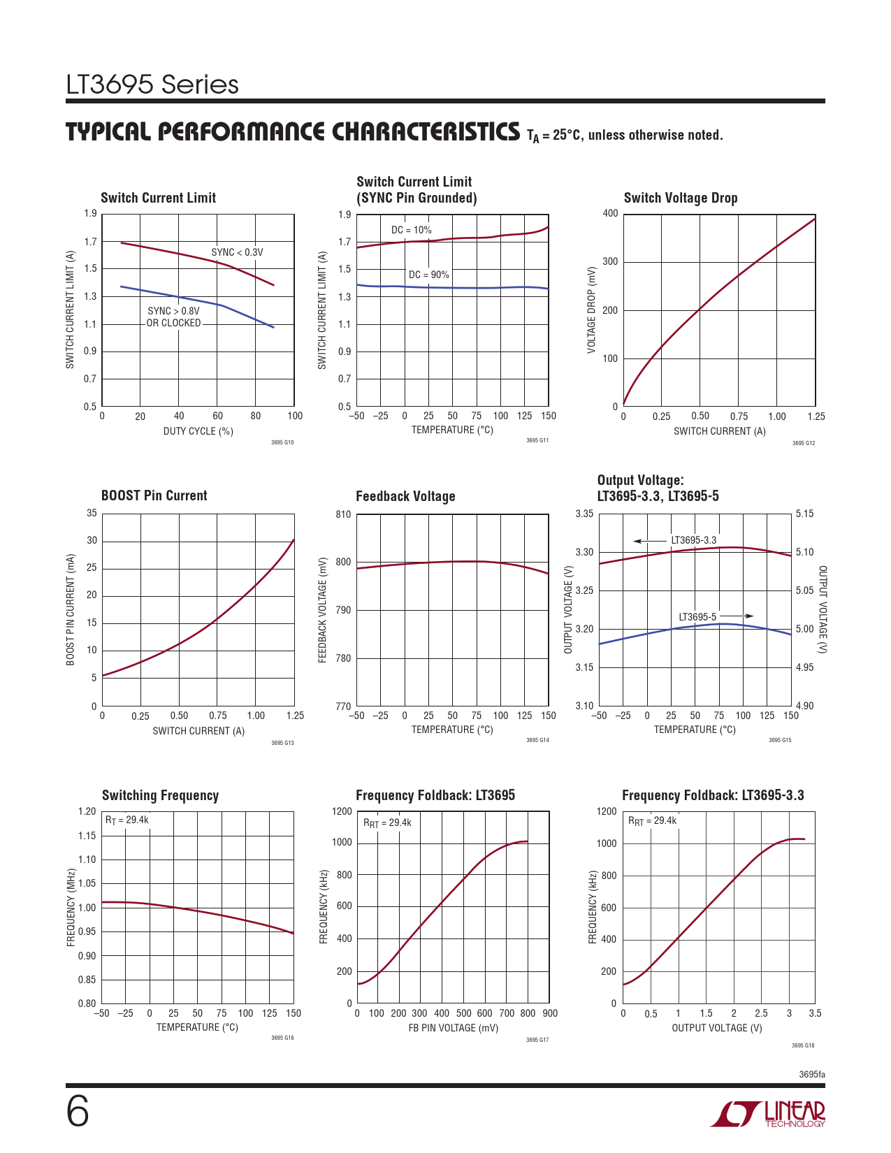 1.9 1.9 400 DC = 10% 1.7 1.7 SYNC < 0.3V 300 1.5 1.5 DC = 90% 1.3 1.3 SYNC > 0.8V 200 1.1 OR CLOCKED 1.1 TAGE DROP (mV) 0.9 0.9 VOL 100 SWITCH CURRENT LIMIT (A) SWITCH CURRENT LIMIT (A) 0.7 0.7 0.5 0.5 0 0 20 40 60 80 100 –50 –25 0 25 50 75 100 125 150 0 0.25 0.50 0.75 1.00 1.25 DUTY CYCLE (%) TEMPERATURE (°C) SWITCH CURRENT (A) 3695 G10 3695 G11 3695 G12