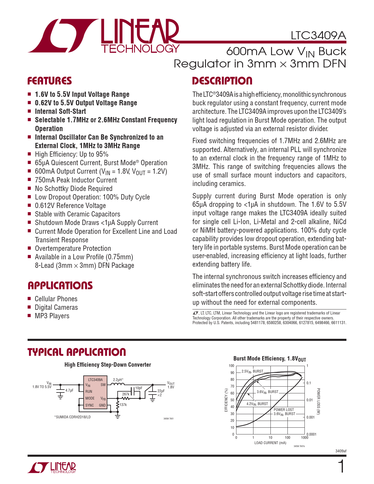 LTC3409A 600mA Low VIN Buck Regulator in 3mm × 3mm DFN FEATURESDESCRIPTION n 1.6V to 5.5V Input Voltage Range The LTC®3409A is a high effi ciency, monolithic synchronous n 0.62V to 5.5V Output Voltage Range buck regulator using a constant frequency, current mode n Internal Soft-Start architecture. The LTC3409A improves upon the LTC3409’s n Selectable 1.7MHz or 2.6MHz Constant Frequency light load regulation in Burst Mode operation. The output Operation voltage is adjusted via an external resistor divider. n Internal Oscillator Can Be Synchronized to an Fixed switching frequencies of 1.7MHz and 2.6MHz are External Clock, 1MHz to 3MHz Range supported. Alternatively, an internal PLL will synchronize n High Effi ciency: Up to 95% to an external clock in the frequency range of 1MHz to n 65μA Quiescent Current, Burst Mode® Operation 3MHz. This range of switching frequencies allows the n 600mA Output Current (VIN = 1.8V, VOUT = 1.2V) use of small surface mount inductors and capacitors, n 750mA Peak Inductor Current including ceramics. n No Schottky Diode Required n Low Dropout Operation: 100% Duty Cycle Supply current during Burst Mode operation is only n 0.612V Reference Voltage 65μA dropping to <1μA in shutdown. The 1.6V to 5.5V n Stable with Ceramic Capacitors input voltage range makes the LTC3409A ideally suited n Shutdown Mode Draws <1μA Supply Current for single cell Li-Ion, Li-Metal and 2-cell alkaline, NiCd n Current Mode Operation for Excellent Line and Load or NiMH battery-powered applications. 100% duty cycle Transient Response capability provides low dropout operation, extending bat- n Overtemperature Protection tery life in portable systems. Burst Mode operation can be n Available in a Low Profi le (0.75mm) user-enabled, increasing effi ciency at light loads, further 8-Lead (3mm × 3mm) DFN Package extending battery life. The internal synchronous switch increases effi ciency and eliminates the need for an external Schottky diode. Internal APPLICATIONS soft-start offers controlled output voltage rise time at start- n Cellular Phones up without the need for external components. n Digital Cameras n MP3 Players L, LT, LTC, LTM, Linear Technology and the Linear logo are registered trademarks of Linear Technology Corporation. All other trademarks are the property of their respective owners. Protected by U.S. Patents, including 5481178, 6580258, 6304066, 6127815, 6498466, 6611131. TYPICAL APPLICATIONBurst Mode Effi ciency, 1.8VOUTHigh Effi ciency Step-Down Converter 100 1 90 2.5VIN, BURST LTC3409A 2.2μH* 80 V V IN OUT 0.1 VIN SW 1.8V TO 5.5V 1.8V 70 POWER LOSS (W) 10pF 4.7μF RUN 22μF 60 3.6VIN, BURST 267k s2 MODE VFB 50 0.01 4.2V 137k IN, BURST SYNC GND 40 EFFICIENCY (%) POWER LOST 30 3.6VIN, BURST *SUMIDA CDRH2D18/LD 0.001 3409A TA01 20 10 0 0.0001 0 1 10 100 1000 LOAD CURRENT (mA) 3409A TA01b 3409af 1