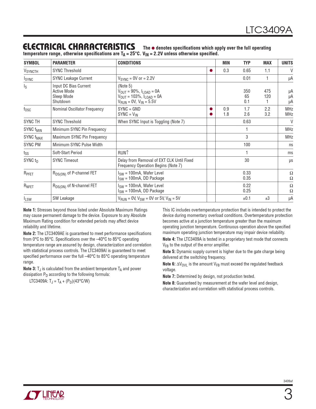 Determined by design, not production tested. LTC3409A: TJ = TA + (PD)(43°C/W)