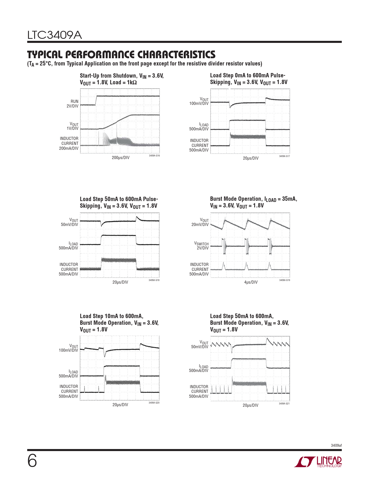 VOUT VOUT 50mV/DIV 100mV/DIV ILOAD ILOAD 500mA/DIV 500mA/DIV INDUCTOR INDUCTOR CURRENT CURRENT 500mA/DIV 500mA/DIV 3409A G20 20μs/DIV 3409A G21 20μs/DIV 3409af 6