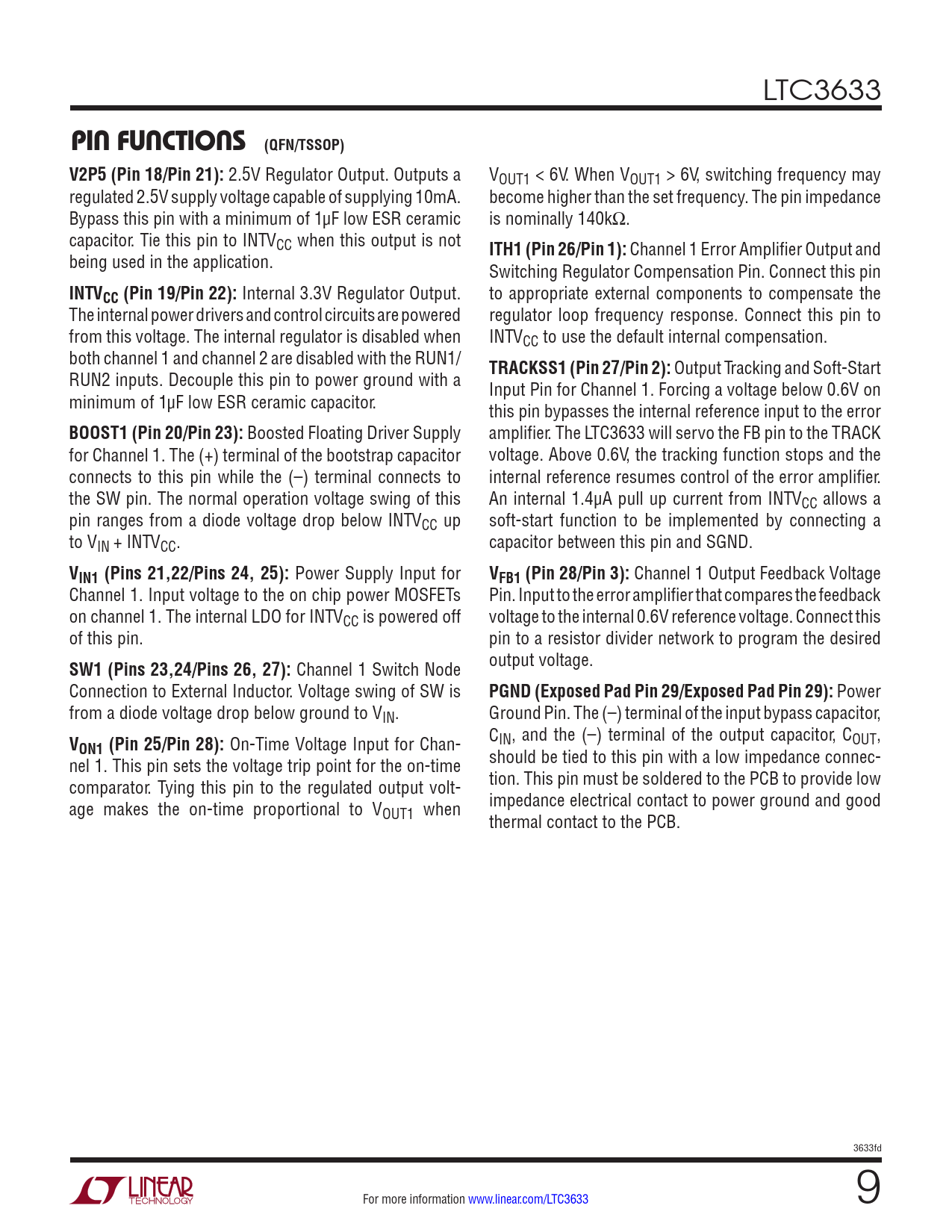 LTC3633 PIN FUNCTIONS (QFN/TSSOP)V2P5 (Pin 18/Pin 21): 2.5V Regulator Output. Outputs a VOUT1 < 6V. When VOUT1 > 6V, switching frequency may regulated 2.5V supply voltage capable of supplying 10mA. become higher than the set frequency. The pin impedance Bypass this pin with a minimum of 1µF low ESR ceramic is nominally 140kΩ. capacitor. Tie this pin to INTVCC when this output is not ITH1 (Pin 26/Pin 1): Channel 1 Error Amplifier Output and being used in the application. Switching Regulator Compensation Pin. Connect this pin INTVCC (Pin 19/Pin 22): Internal 3.3V Regulator Output. to appropriate external components to compensate the The internal power drivers and control circuits are powered regulator loop frequency response. Connect this pin to from this voltage. The internal regulator is disabled when INTVCC to use the default internal compensation. both channel 1 and channel 2 are disabled with the RUN1/ TRACKSS1 (Pin 27/Pin 2): Output Tracking and Soft-Start RUN2 inputs. Decouple this pin to power ground with a Input Pin for Channel 1. Forcing a voltage below 0.6V on minimum of 1µF low ESR ceramic capacitor. this pin bypasses the internal reference input to the error BOOST1 (Pin 20/Pin 23): Boosted Floating Driver Supply amplifier. The LTC3633 will servo the FB pin to the TRACK for Channel 1. The (+) terminal of the bootstrap capacitor voltage. Above 0.6V, the tracking function stops and the connects to this pin while the (–) terminal connects to internal reference resumes control of the error amplifier. the SW pin. The normal operation voltage swing of this An internal 1.4µA pull up current from INTVCC allows a pin ranges from a diode voltage drop below INTVCC up soft-start function to be implemented by connecting a to VIN + INTVCC. capacitor between this pin and SGND. VIN1 (Pins 21,22/Pins 24, 25): Power Supply Input for VFB1 (Pin 28/Pin 3): Channel 1 Output Feedback Voltage Channel 1. Input voltage to the on chip power MOSFETs Pin. Input to the error amplifier that compares the feedback on channel 1. The internal LDO for INTVCC is powered off voltage to the internal 0.6V reference voltage. Connect this of this pin. pin to a resistor divider network to program the desired SW1 (Pins 23,24/Pins 26, 27): Channel 1 Switch Node output voltage. Connection to External Inductor. Voltage swing of SW is PGND (Exposed Pad Pin 29/Exposed Pad Pin 29): Power from a diode voltage drop below ground to VIN. Ground Pin. The (–) terminal of the input bypass capacitor, V CIN, and the (–) terminal of the output capacitor, COUT, ON1 (Pin 25/Pin 28): On-Time Voltage Input for Chan- nel 1. This pin sets the voltage trip point for the on-time should be tied to this pin with a low impedance connec- comparator. Tying this pin to the regulated output volt- tion. This pin must be soldered to the PCB to provide low age makes the on-time proportional to V impedance electrical contact to power ground and good OUT1 when thermal contact to the PCB. 3633fd For more information www.linear.com/LTC3633 9 Document Outline Features Applications Description Typical Application Absolute Maximum Ratings Pin Configuration Order Information Electrical Characteristics Typical Performance Characteristics Pin Functions Block Diagram Operation Applications Information Typical Applications Package Description Revision History Typical Application Related Parts