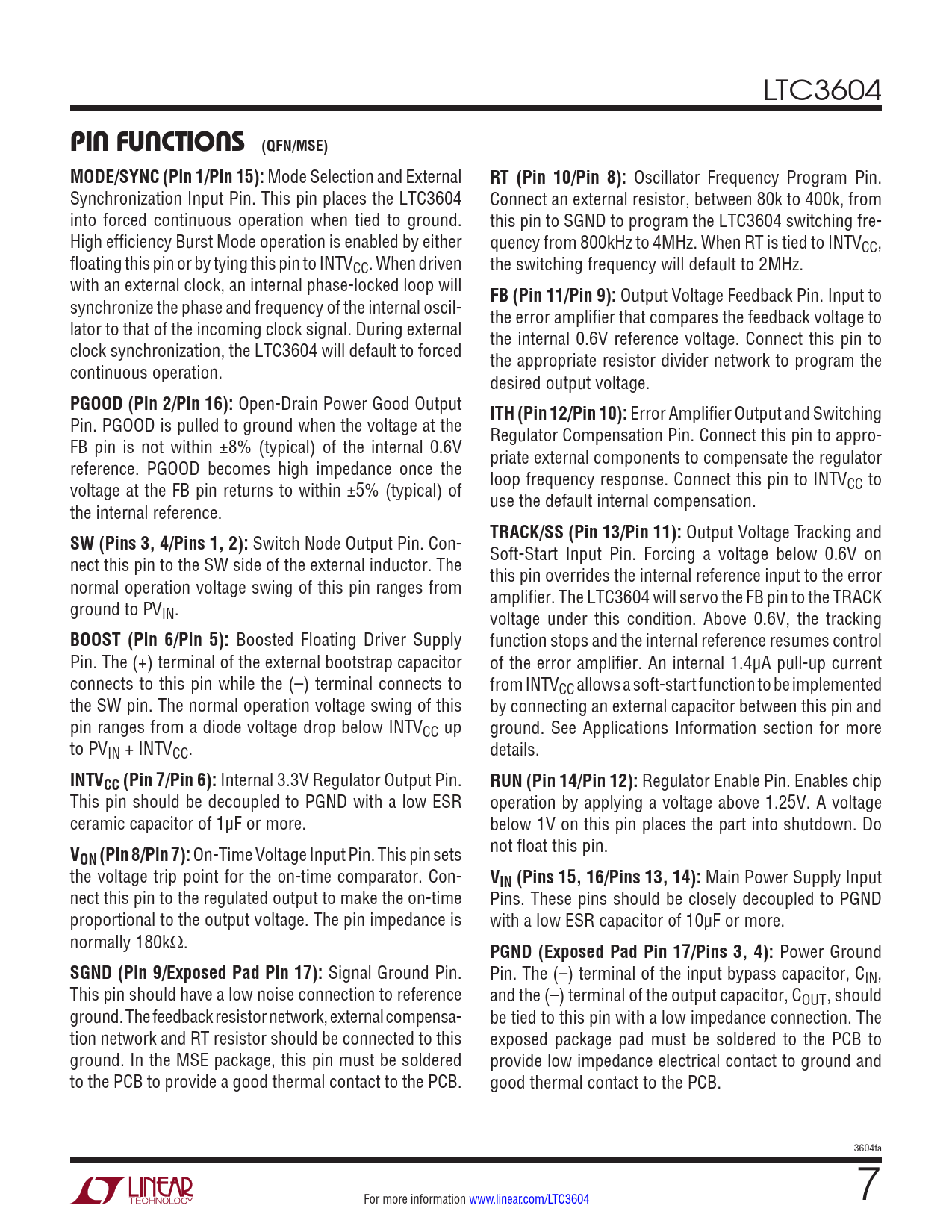 PIN FUNCTIONS (QFN/MSE) MODE/SYNC (Pin 1/Pin 15):. RT (Pin 10/Pin 8):. FB (Pin 11/Pin 9):. PGOOD (Pin 2/Pin 16):