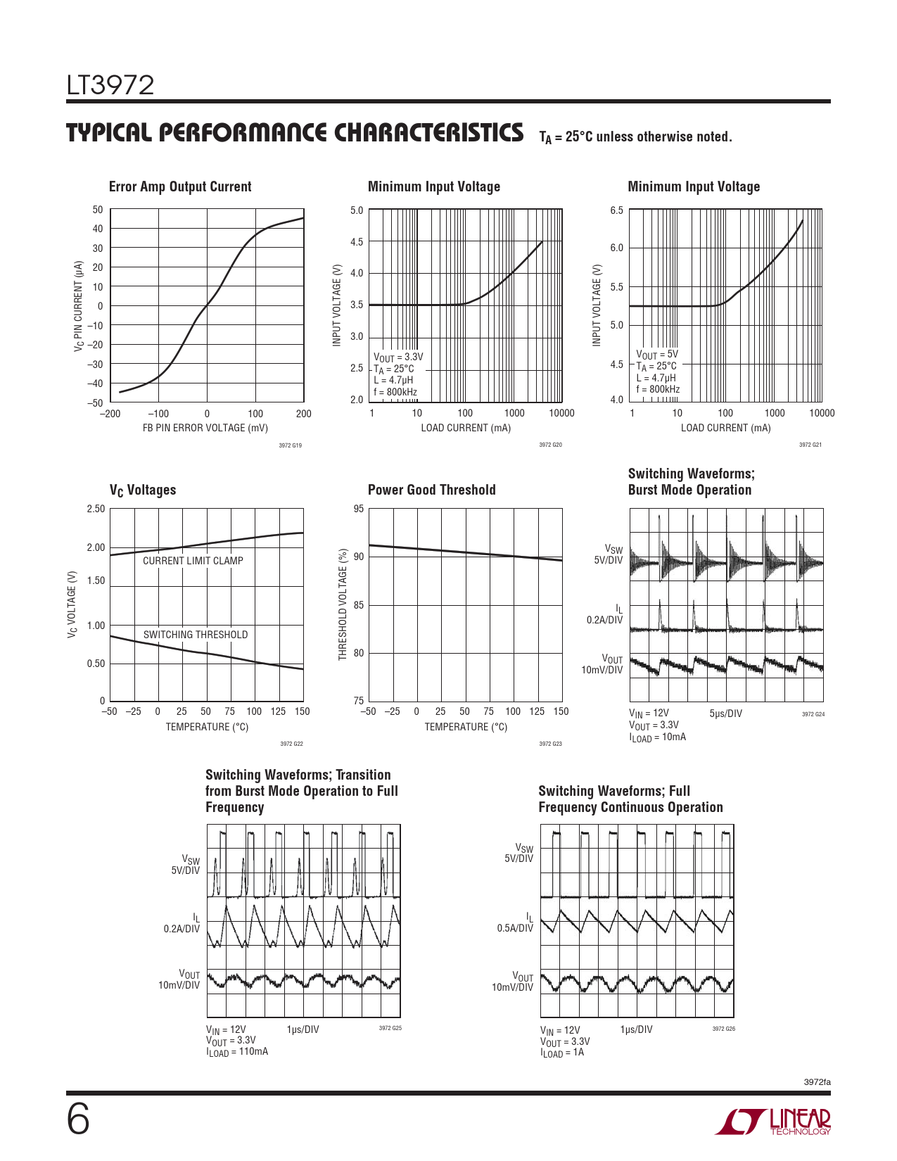 VSW VSW 5V/DIV 5V/DIV IL IL 0.2A/DIV 0.5A/DIV VOUT VOUT 10mV/DIV 10mV/DIV 3972 G25 VIN = 12V 1μs/DIV 3972 G26 VIN = 12V 1μs/DIV VOUT = 3.3V VOUT = 3.3V ILOAD = 110mA ILOAD = 1A 3972fa 6