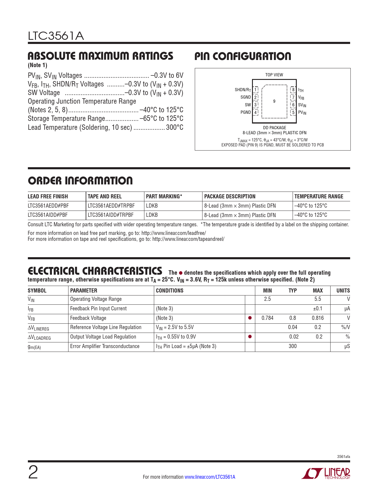LTC3561A ABSOLUTE MAXIMUM RATINGSPIN CONFIGURATION(Note 1) PVIN, SVIN Voltages ... –0.3V to 6V TOP VIEW VFB, ITH, SHDN/RT Voltages ..–0.3V to (VIN + 0.3V) SW Voltage ..–0.3V to (V SHDN/RT 1 8 I IN + 0.3V) TH Operating Junction Temperature Range SGND 2 7 VFB 9 SW 3 6 SV (Notes 2, 5, 8) .. –40°C to 125°C IN PGND 4 5 PVIN Storage Temperature Range ... –65°C to 125°C Lead Temperature (Soldering, 10 sec) .. 300°C DD PACKAGE 8-LEAD (3mm × 3mm) PLASTIC DFN TJMAX = 125°C, θJA = 43°C/W, θJC = 3°C/W EXPOSED PAD (PIN 9) IS PGND, MUST BE SOLDERED TO PCB ORDER INFORMATION LEAD FREE FINISHTAPE AND REELPART MARKING*PACKAGE DESCRIPTIONTEMPERATURE RANGE LTC3561AEDD#PBF LTC3561AEDD#TRPBF LDKB 8-Lead (3mm × 3mm) Plastic DFN –40°C to 125°C LTC3561AIDD#PBF LTC3561AIDD#TRPBF LDKB 8-Lead (3mm × 3mm) Plastic DFN –40°C to 125°C Consult LTC Marketing for parts specified with wider operating temperature ranges. *The temperature grade is identified by a label on the shipping container. For more information on lead free part marking, go to: http://www.linear.com/leadfree/ For more information on tape and reel specifications, go to: http://www.linear.com/tapeandreel/ ELECTRICAL CHARACTERISTICSThe ● denotes the specifications which apply over the full operatingtemperature range, otherwise specifications are at TA = 25°C. VIN = 3.6V, RT = 125k unless otherwise specified. (Note 2) SYMBOLPARAMETERCONDITIONSMINTYPMAXUNITS VIN Operating Voltage Range 2.5 5.5 V IFB Feedback Pin Input Current (Note 3) ±0.1 µA VFB Feedback Voltage (Note 3) ● 0.784 0.8 0.816 V ΔVLINEREG Reference Voltage Line Regulation VIN = 2.5V to 5.5V 0.04 0.2 %/V ΔVLOADREG Output Voltage Load Regulation ITH = 0.55V to 0.9V ● 0.02 0.2 % gm(EA) Error Amplifier Transconductance ITH Pin Load = ±5µA (Note 3) 300 µS 3561afa 2 For more information www.linear.com/LTC3561A