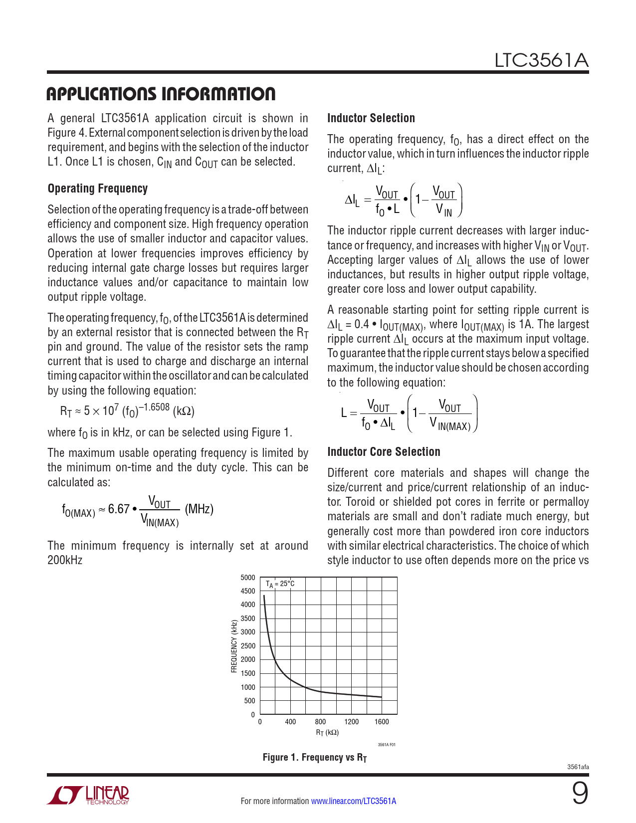the minimum on-time and the duty cycle. This can be Different core materials and shapes will change the calculated as: size/current and price/current relationship of an induc- V f OUT tor. Toroid or shielded pot cores in ferrite or permalloy O(MAX) ≈ 6.67 • (MHz) materials are small and don’t radiate much energy, but V IN(MAX) generally cost more than powdered iron core inductors The minimum frequency is internally set at around with similar electrical characteristics. The choice of which 200kHz style inductor to use often depends more on the price vs 5000 TA = 25°C 4500 4000 3500 3000 2500 2000 FREQUENCY (kHz) 1500 1000 500 0 0 400 800 1200 1600 RT (kΩ) 3561A F01