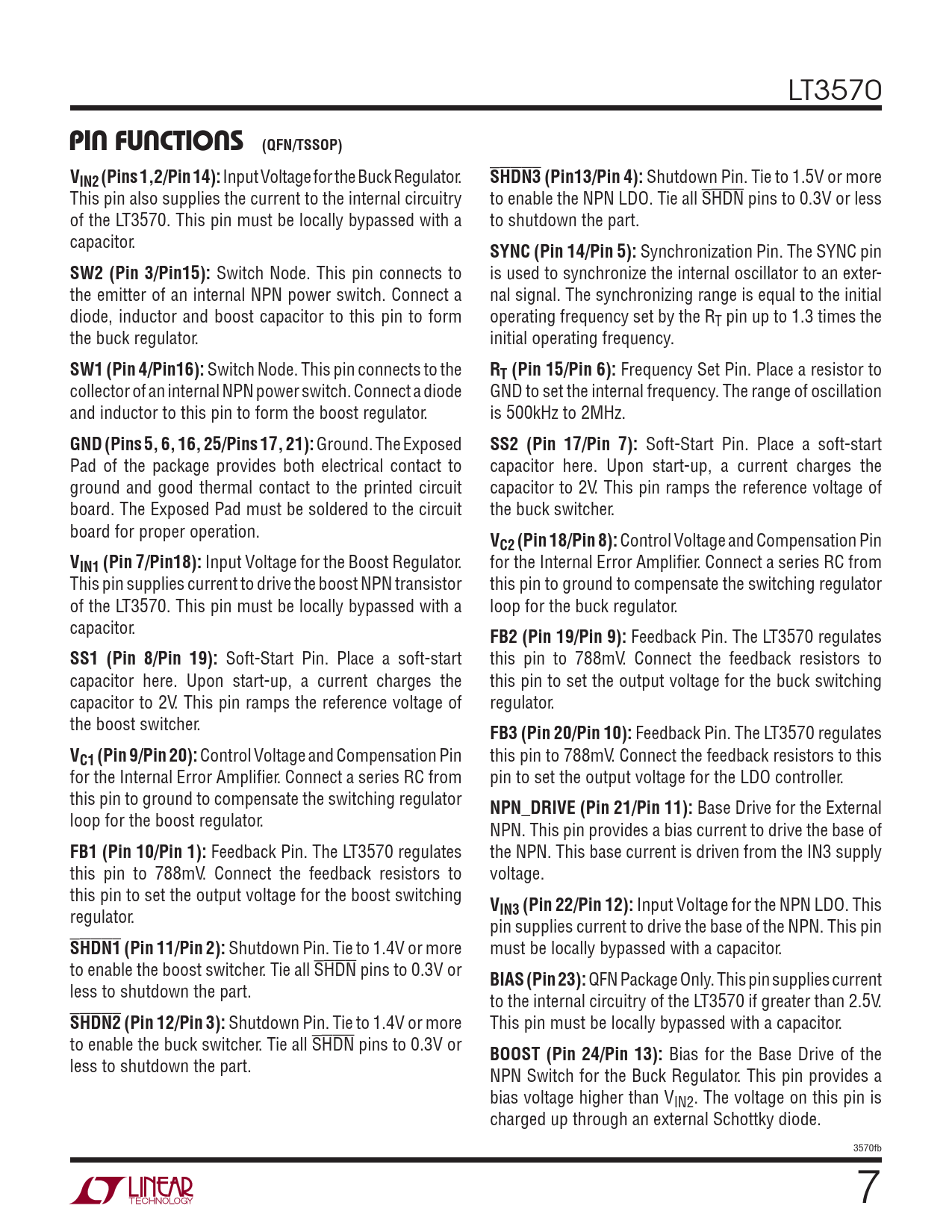 PIN FUNCTIONS (QFN/TSSOP). VIN2 (Pins 1,2/Pin 14):. SHDN3 (Pin13/Pin 4):. SYNC (Pin 14/Pin 5):. SW2 (Pin 3/Pin15):