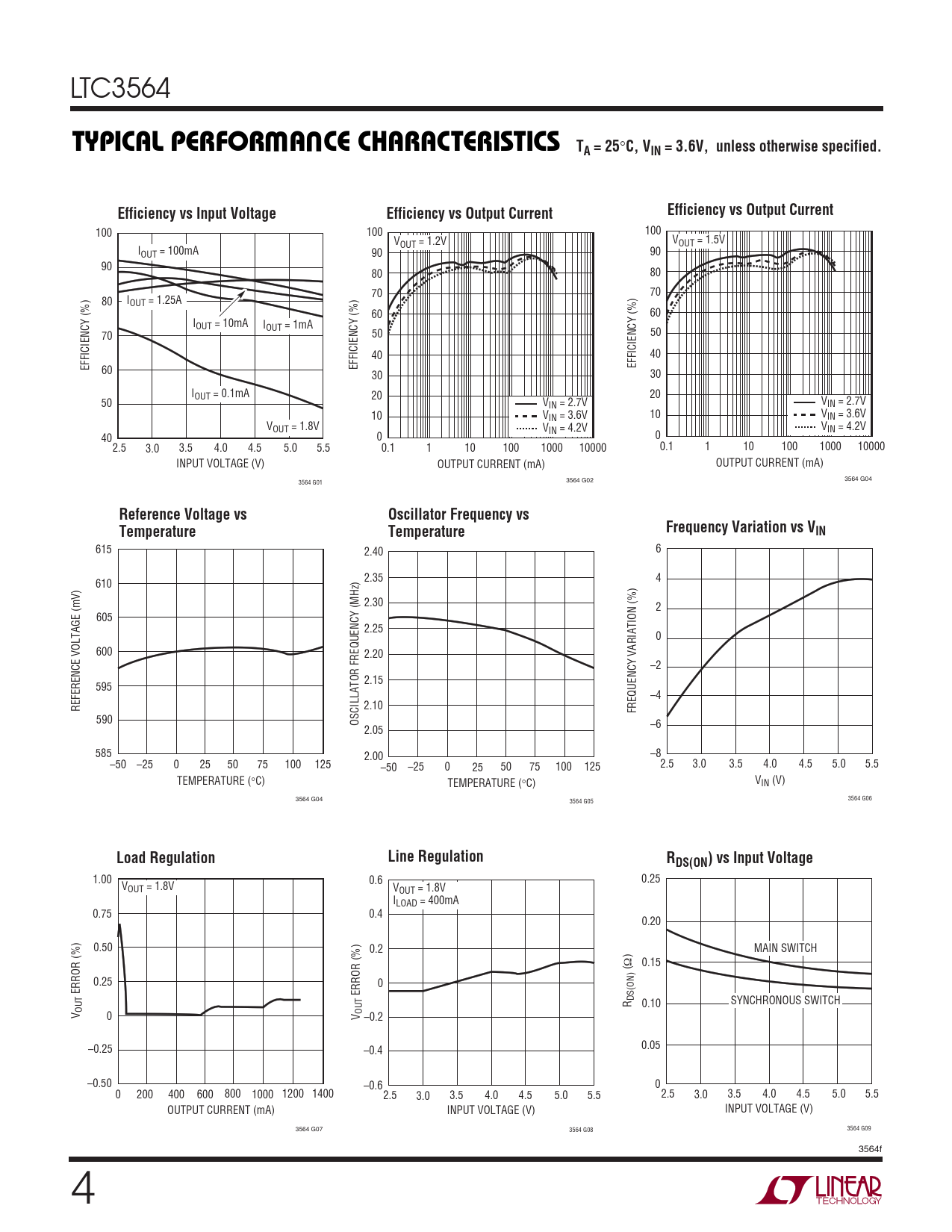 615 2.40 6 2.35 4 610 2.30 2 605 2.25 0 600 2.20 –2 2.15 595 –4 REFERENCE VOLTAGE (mV) 2.10 FREQUENCY VARIATION (%) 590 OSCILLATOR FREQUENCY (MHz) –6 2.05 585 2.00 –8 –50 –25 0 25 50 75 100 125 –50 –25 0 25 50 75 100 125 2.5 3.0 3.5 4.0 4.5 5.0 5.5 TEMPERATURE (°C) TEMPERATURE (°C) VIN (V) 3564 G04 3564 G06 3564 G05